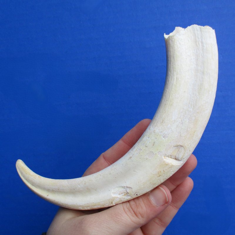One B-Grade African Warthog Tusk for sale, measuring approximately 9 inches in length. - This is a B-Grade warthog tusk, meaning it may have some cracks, chips, divots, marks, scrapes, etc. Review all photos. Tusks are measured around the curve of the tusk using a cloth tape measure - NOT straight using a wood ruler. Warthog tusks and warthog ivory are used for carving, making handles, in the art of scrimshaw and in taxidermy crafts.