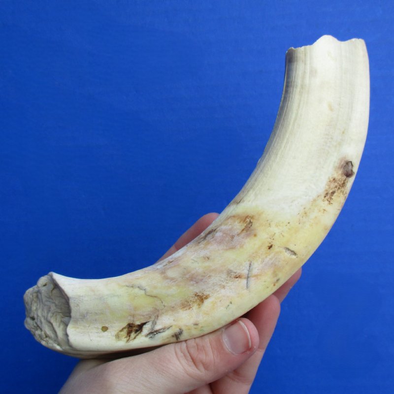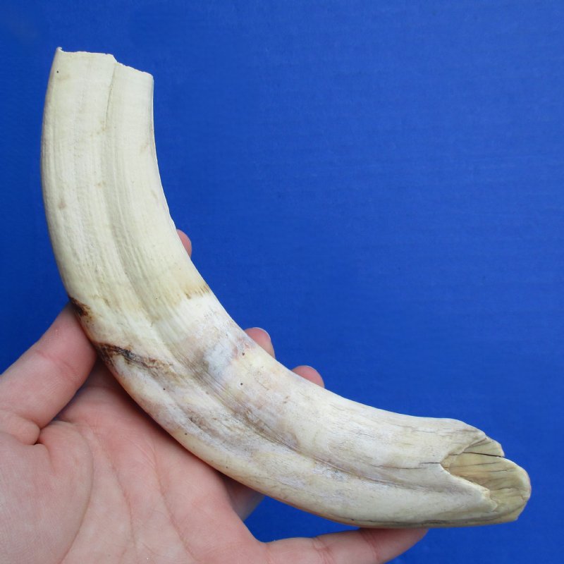 One B-Grade African Warthog Tusk for sale, measuring approximately 9 inches in length. - This is a B-Grade warthog tusk, meaning it may have some cracks, chips, divots, marks, scrapes, etc. Review all photos. Tusks are measured around the curve of the tusk using a cloth tape measure - NOT straight using a wood ruler. Warthog tusks and warthog ivory are used for carving, making handles, in the art of scrimshaw and in taxidermy crafts.