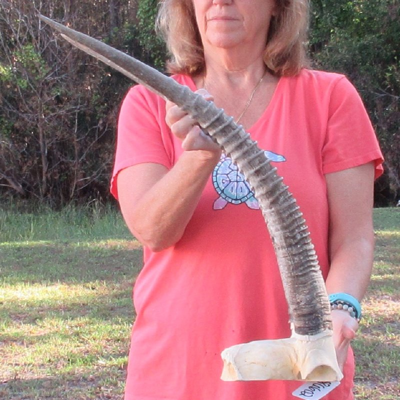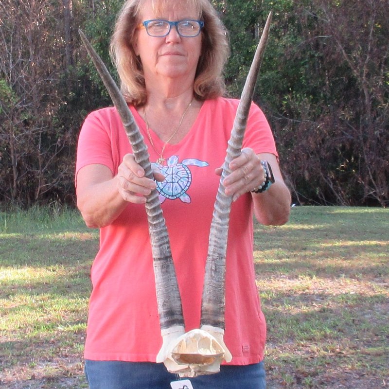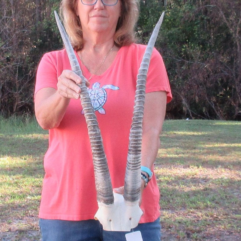 B-Grade African Female Sable Skull Plate (Hippotragus niger) for sale with horns measuring approximately 27 inches, measured around the curve of the horns, using a cloth tape measure -- not straight with a wood ruler. -  Review photos. All of our skull plates and horns are commercial grade and imperfect. They will have imperfections due to the natural aging process and living in the wild--scars, blemishes, rub areas, broken or missing teeth, bug bite marks, etc. This skull plate and horns were cleared by the U.S Fish and Wildlife Services and U.S Customs Services for legal entry into the United States. They were obtained from the African Government's Culling Program.