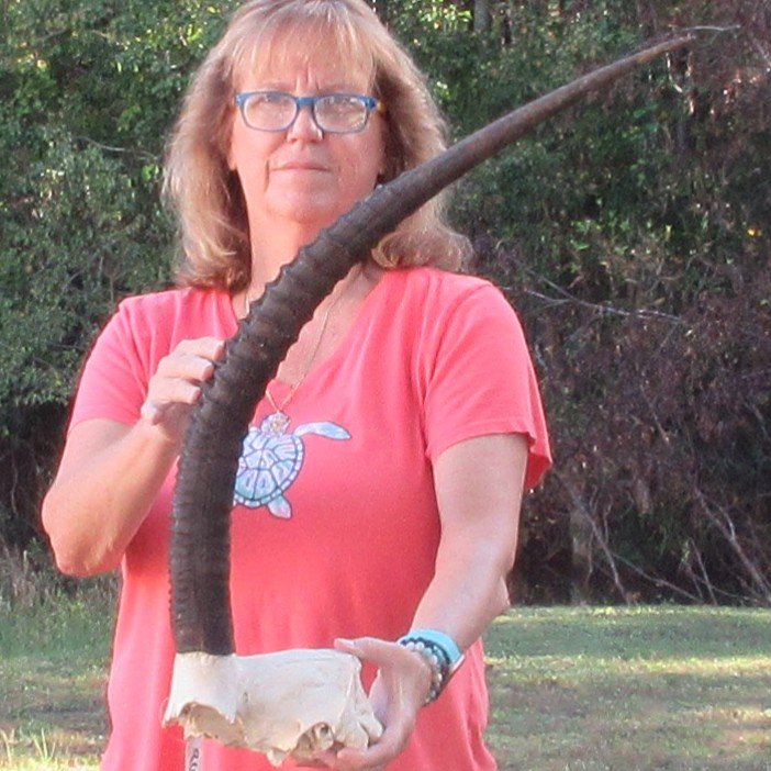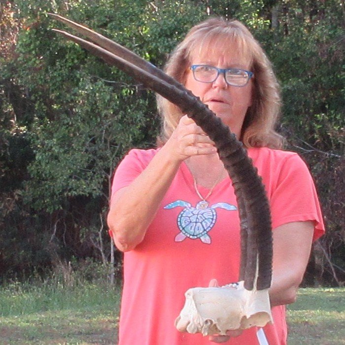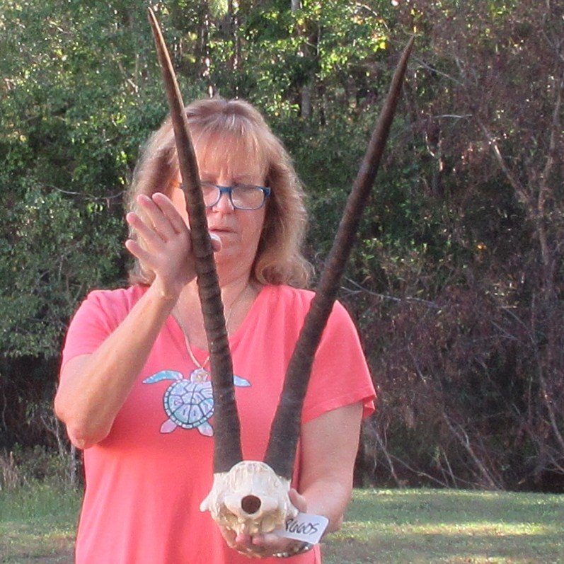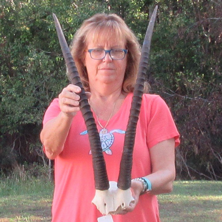 B-Grade African Female Sable Skull Plate (Hippotragus niger) for sale with horns measuring approximately 30 inches, measured around the curve of the horns, using a cloth tape measure -- not straight with a wood ruler. - Rough horns and split down horn.  Review photos. All of our skull plates and horns are commercial grade and imperfect. They will have imperfections due to the natural aging process and living in the wild--scars, blemishes, rub areas, broken or missing teeth, bug bite marks, etc. This skull plate and horns were cleared by the U.S Fish and Wildlife Services and U.S Customs Services for legal entry into the United States. They were obtained from the African Government's Culling Program.