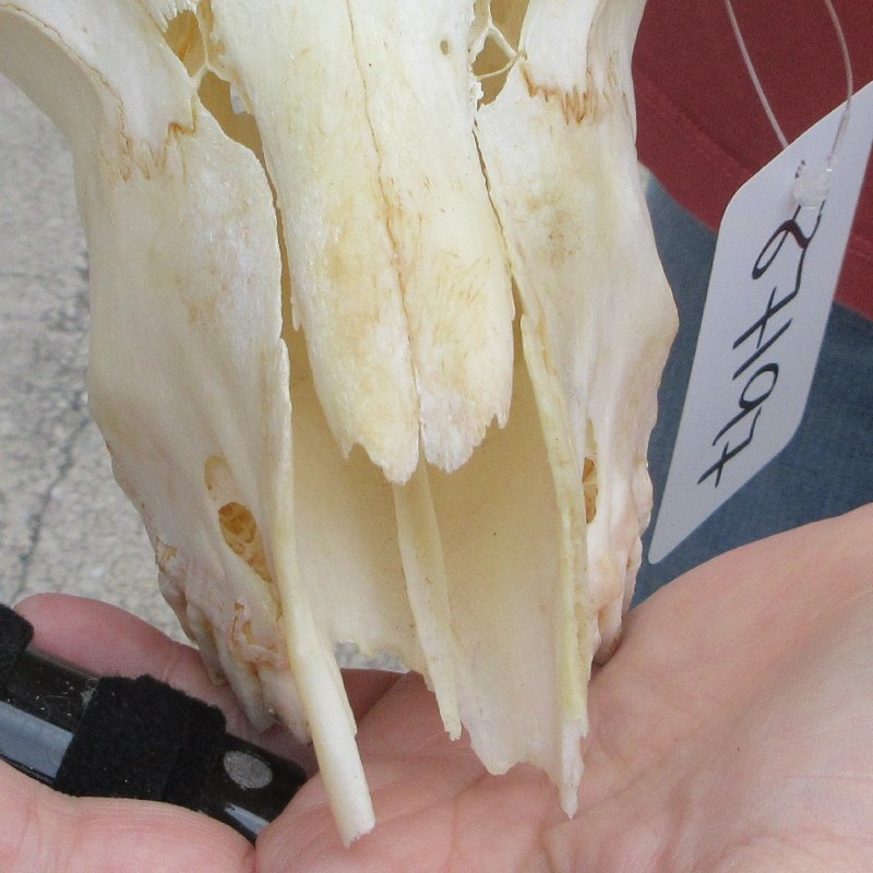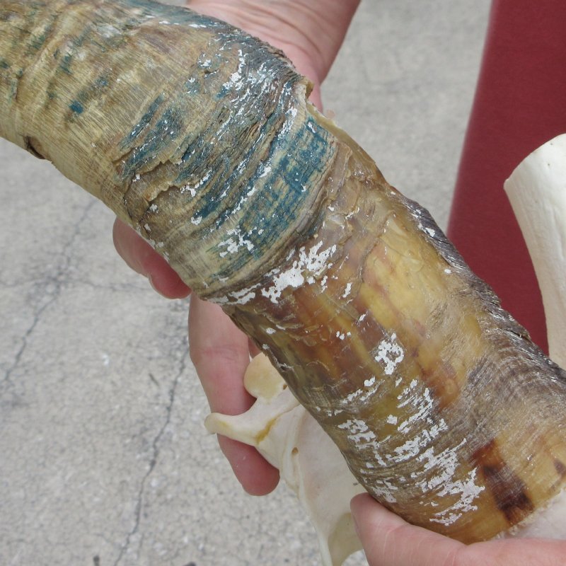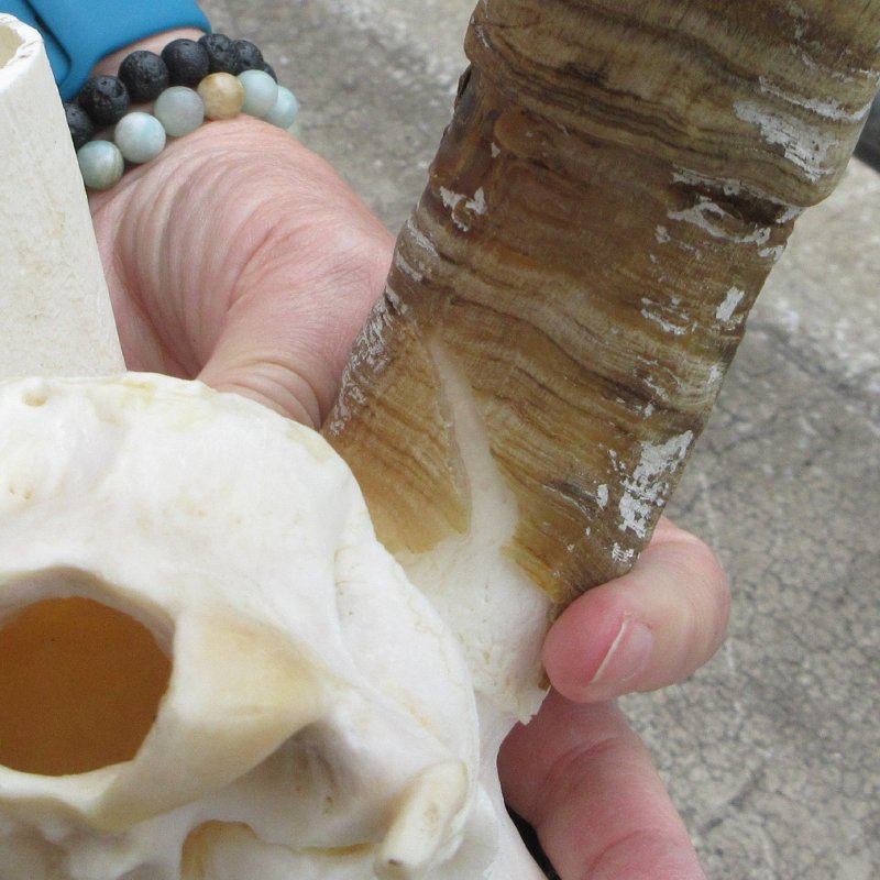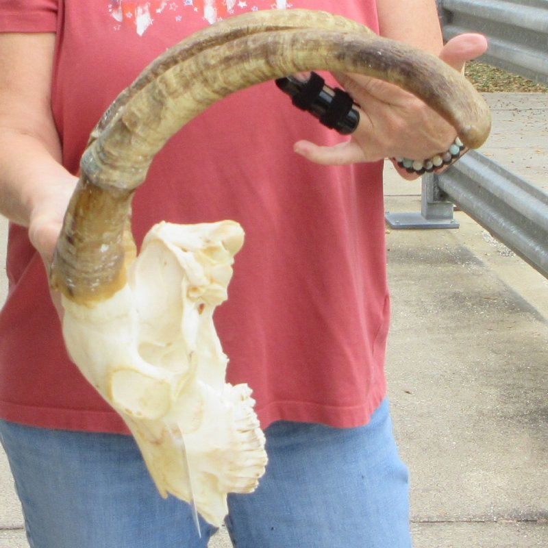 B-Grade African Domesticated Goat Skull with approximately 20 inch horns (measured around the curve of the horn with a cloth tape measure) and an estimated 10 inch long skull.  - Damage to nose with holes, white and green marks on horn, and split at base of both horns, one longer then the other  . Review all photos. This is a domesticated African goat and will have imperfections due to the natural aging process and fighting and living -- scars, blemishes, rub areas, broken teeth, etc. All our goat skulls with horns are by-products of the African Government's culling program and farming industry. All products were professional cleaned and/or professionally tanned in South Africa and cleared by the U. S. Fish and Wildlife Services and U.S. Customs Services for legal entry into the United States.