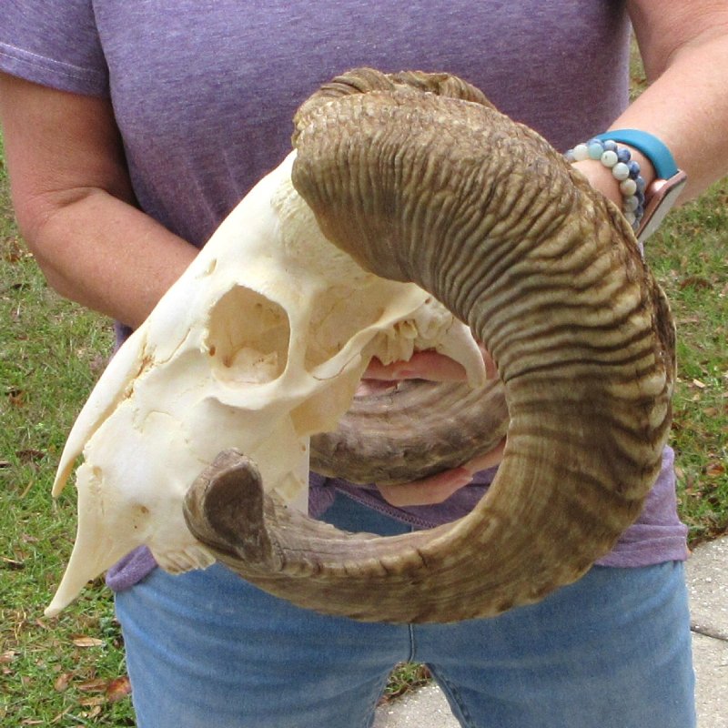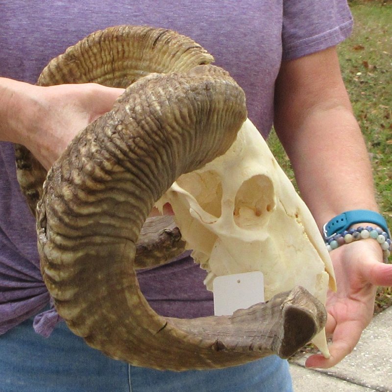 B-Grade African Merino sheep skull and horns, or ram skull and horns (Ovis aries). The sheep horns measure approximately 25 inches, measured around the curl of the horns. Horns don't fit all the way down. - Review all photos. This sheep skull and horns is ready for display and would be perfect for rustic cabin decor or log cabin decor. This sheep skull and horns, or ram skull and horns was imported from Africa and cleared for legal entry into the U.S. by the U.S. Fish and Wildlife Department and U.S. Customs Department.