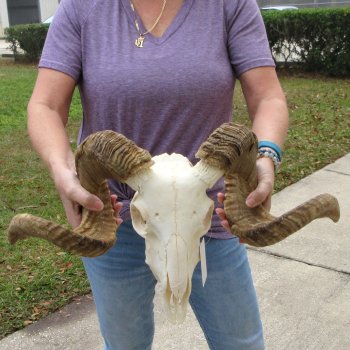 B-Grade African Merino sheep skull and horns, or ram skull and horns (Ovis aries). The sheep horns measure approximately 28 inches, measured around the curl of the horns. Horns don't fit all the way down and chunk missing from horn. - Review all photos. This sheep skull and horns is ready for display and would be perfect for rustic cabin decor or log cabin decor. This sheep skull and horns, or ram skull and horns was imported from Africa and cleared for legal entry into the U.S. by the U.S. Fish and Wildlife Department and U.S. Customs Department.