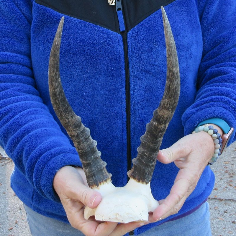 B-Grade Blesbok Skull Plate (Damaliscus dorcas phillipsi) for sale with horns measuring approximately 11 inches around the curve of the horns with a cloth tape measure - not straight up and down with a ruler. - Skull plate has a crack down the center. Review all photos. This is a real blesbok skull with horns and will have imperfections caused by the animal living and aging in the wild.