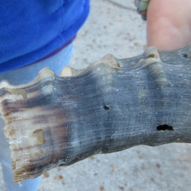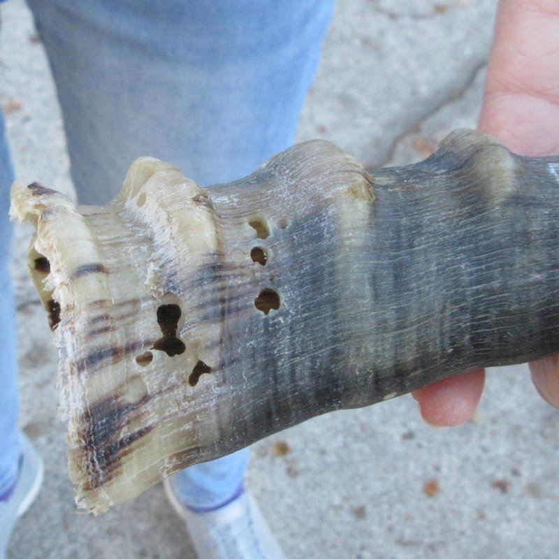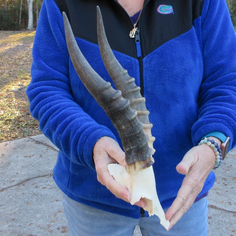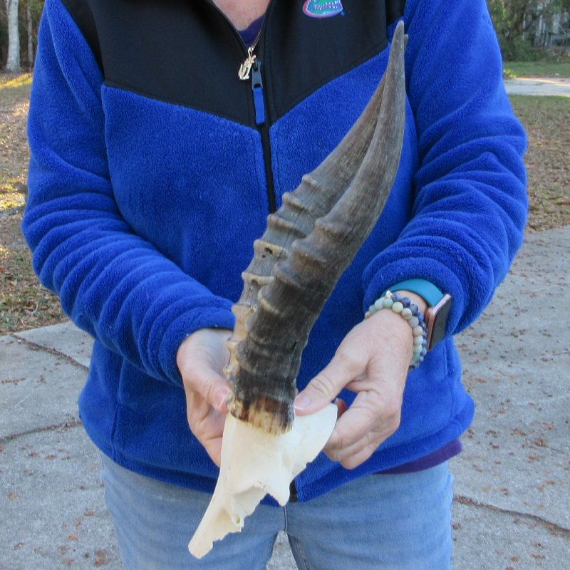 B-Grade Blesbok Skull Plate (Damaliscus dorcas phillipsi) for sale with horns measuring approximately 12 inches around the curve of the horns with a cloth tape measure - not straight up and down with a ruler. - Skull plate has a crack down the center, several holes on both horns, chip in one of the horns, and some fraying. Review all photos. This is a real blesbok skull with horns and will have imperfections caused by the animal living and aging in the wild.