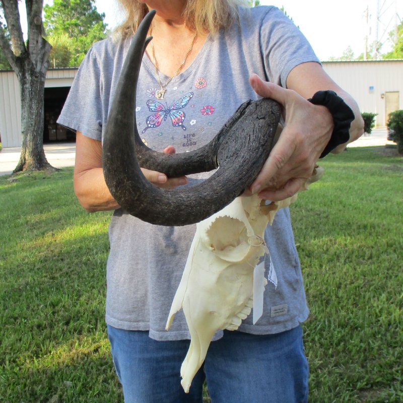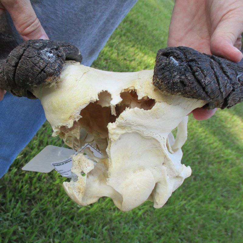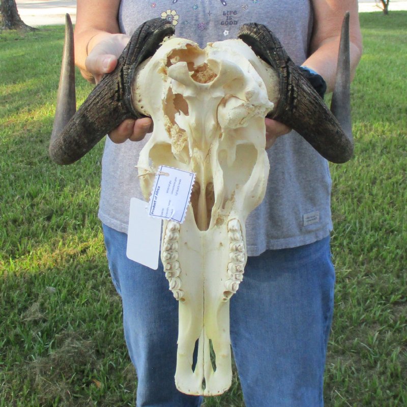 B-Grade, Female, African Black Wildebeest Skull (Connochaetes gnau) for sale. This female black wildebeest skull with horns has a horn spread of approximately 15 inches wide and the skull is approximately 15 inches long. This is a B-Grade Black Wildebeest skull - There will be holes, cracks, discoloration, missing teeth and damage throughout the skull. Horns will have cracks, fraying, bullet fragments, etc. - Review all photos carefully. This is a real black wildebeest skull with horns and will have imperfections caused by the animal living in the wild and fighting.