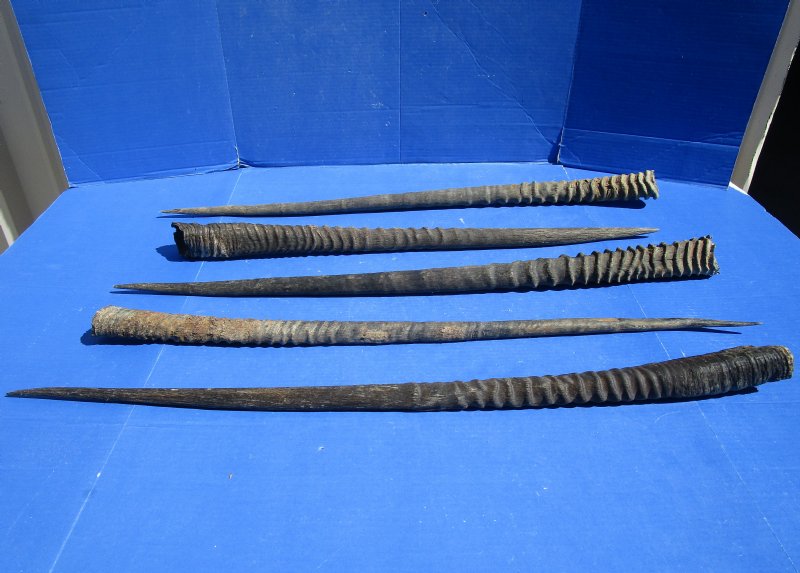 Wholesale B-Grade gemsbok horns for sale, commercial grade, measuring approximately 25 inches long to 36 inches long. These are B-Grade horns they will have cuts, scars, blemishes, fraying, weathered, damage to tips, holes, drill holes near tip area, slits, etc. Review the photos. Gemsbok horns are used for making gemsbok bows,  shofars, furniture and blowing horns. Wholesale gemsbok horns are also used in crafting furniture, knife and cane handles and in numerous other taxidermy crafts.