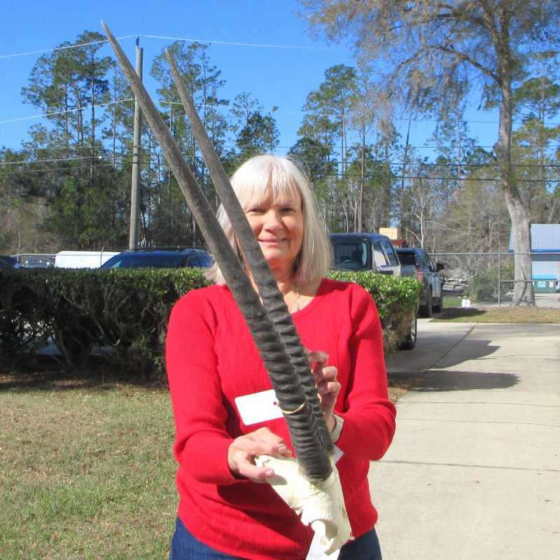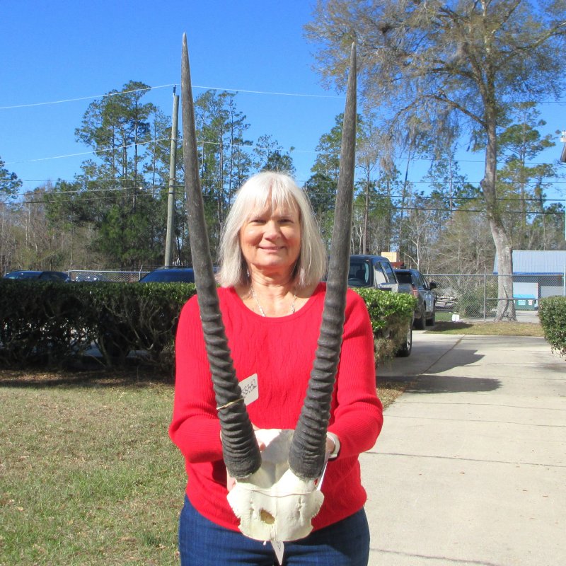 B-Grade Gemsbok skull plate with 28 & 29 inch horns imported from South Africa.  - Hole in skull plate. Rough horns. Review all photos.  Gemsbok horns on gemsbok skull plates are perfect for rustic cabin decor and African themed decorating.  Our gemsbok horns on skull plates are from wild African gemsbok and will have imperfections normally found on all wild animal horns. We are direct importers of African animal horns. These gemsbok horns are a by-product of the African government's culling programs and the African farming industry. These horns have been cleared for legal entry into the U.S. by the U.S. Fish and Wildlife Service and U.S. Customs Department.