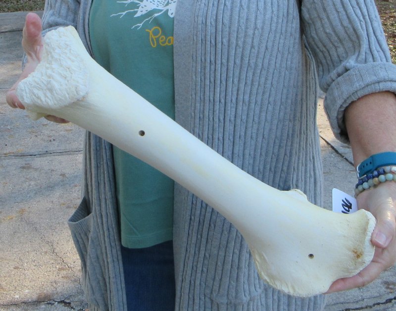 B-Grade African Giraffe Femur Leg Bone (Giraffa camelopardalis) from the upper leg bone measures approximately 17 inches long.  Drill holes - Review all photos. This bone is from a real African giraffe and will have natural imperfections such as cracks, holes, fine lines, chipped edges, stains, and putty patchwork, etc. that are found on all animal bones. It has been cleaned, but not whitened. This giraffe bone has been cleared for legal entry into the U.S. by the U.S Fish and Wildlife Service and U.S Customs.