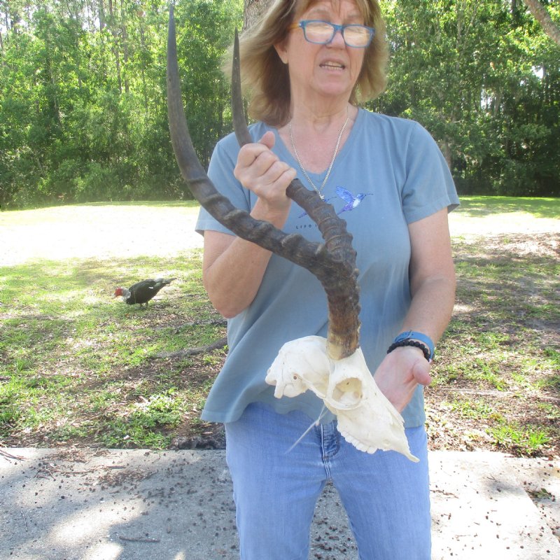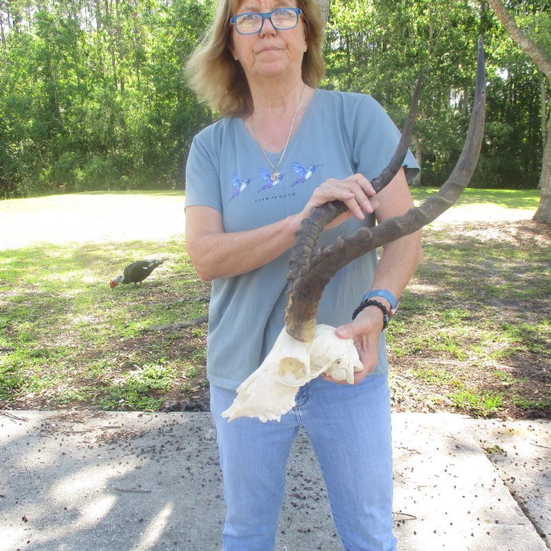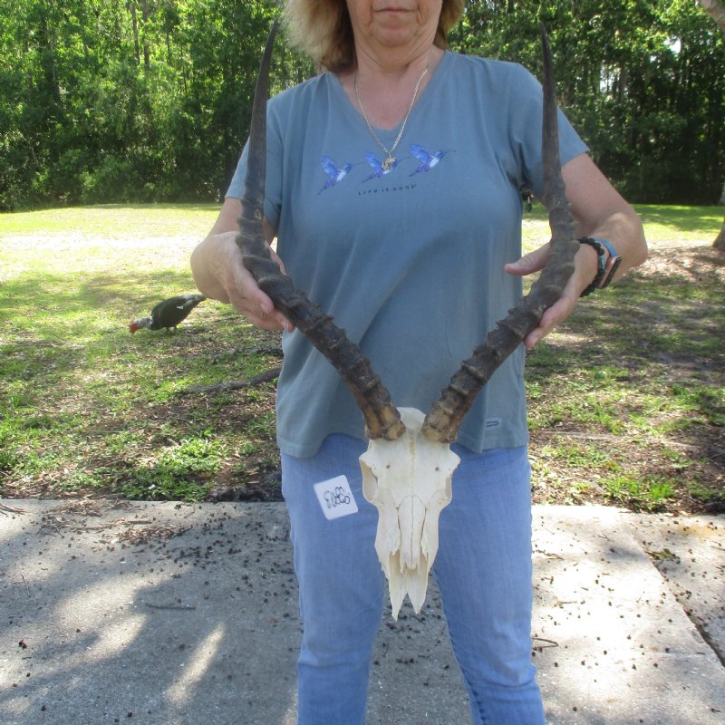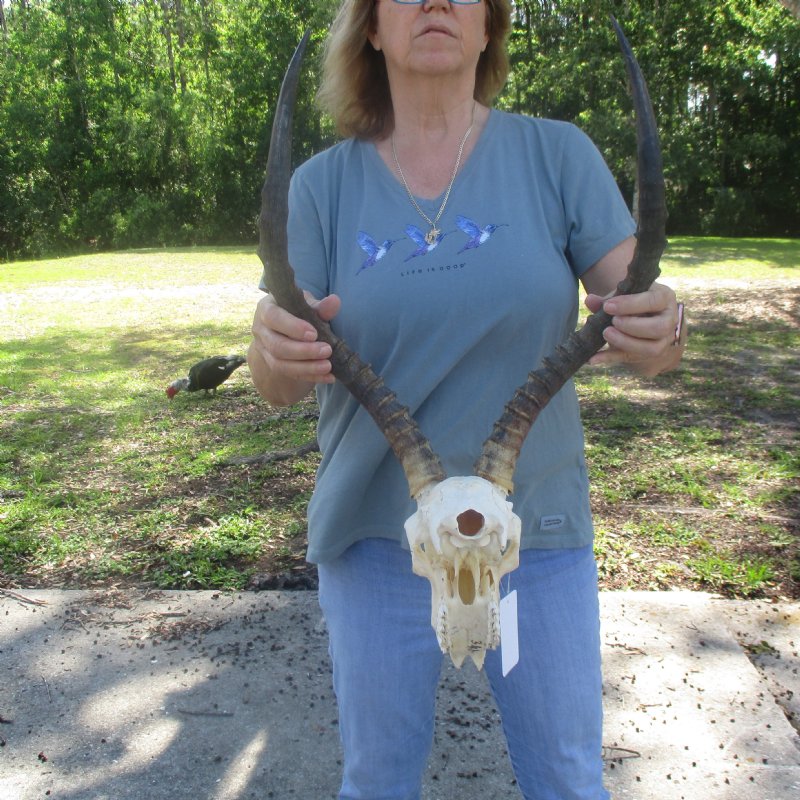 B-Grade African Impala Skull (Aepyceros melampus) for sale, with Horns measuring approximately 21 inches longThe skull measures approximately 9 inches in length. -Damaged skull, and teeth missing. Review all photos. You will receive the skull with horns shown in the photo. All horns are measured around the curve of the horn using a cloth tape measureAll of our skulls with horns are commercial grade and imperfect. They will have imperfections due to the natural aging process and living in the wild--scars, blemishes, rub areas, broken or missing teeth, bug bite marks, etc. This skull was cleared by the U.S Fish and Wildlife Services and U.S Customs Services for legal entry into the United States. They were obtained from the African Government's Culling Program.