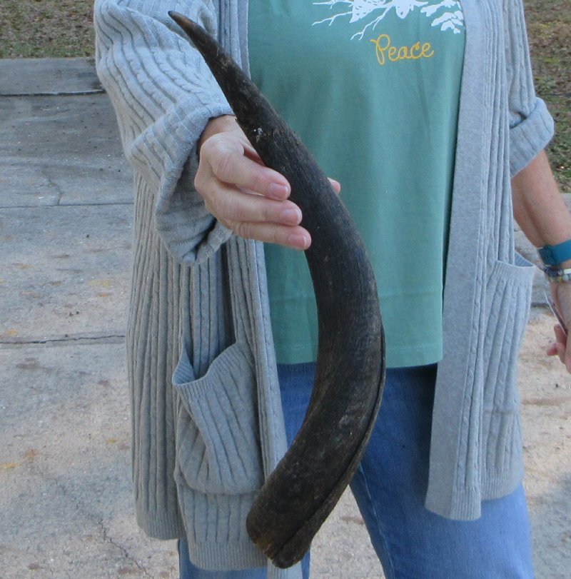 B-Grade Kudu horn for sale (Tragelaphus angasi) imported from South Africa, measuring approximately 21 inch, measured around the curl of the horn - not straight. Gouges- Review photos. Kudu horns are used in making shofars, blowing horns, kudu horn instruments, furniture legs, lamps, sconces, knife handles, cane handles, inlaid crafts and numerous other taxidermy crafts.