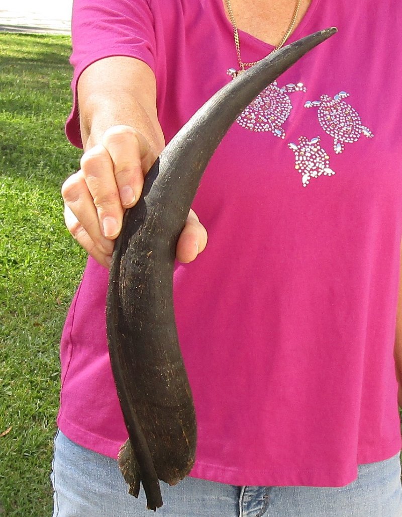 B-Grade Kudu horn for sale (Tragelaphus angasi) imported from South Africa, measuring approximately 16-1/2 inch, measured around the curl of the horn - not straight. Split at base - Review photos. Kudu horns are used in making blowing horns, kudu horn instruments, furniture legs, lamps, sconces, knife handles, cane handles, inlaid crafts and numerous other taxidermy crafts.