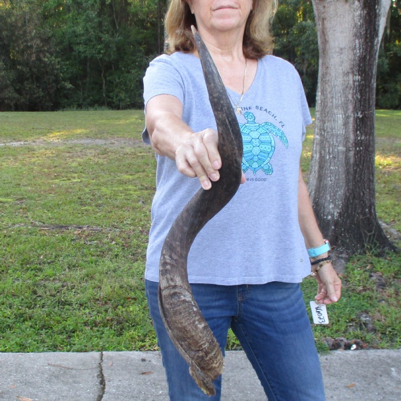 B-Grade Kudu horn for sale (Tragelaphus angasi) imported from South Africa, measuring approximately 32 inch, measured around the curl of the horn - not straight. Frayed and piece missing at base of horn - Review photos. Kudu horns are used in making blowing horns, kudu horn instruments, furniture legs, lamps, sconces, knife handles, cane handles, inlaid crafts and numerous other taxidermy crafts.