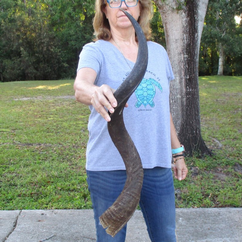 B-Grade Kudu horn for sale (Tragelaphus angasi) imported from South Africa, measuring approximately 37 inch, measured around the curl of the horn - not straight. Splits at base of horn. - Review photos. Kudu horns are used in making blowing horns, kudu horn instruments, furniture legs, lamps, sconces, knife handles, cane handles, inlaid crafts and numerous other taxidermy crafts.