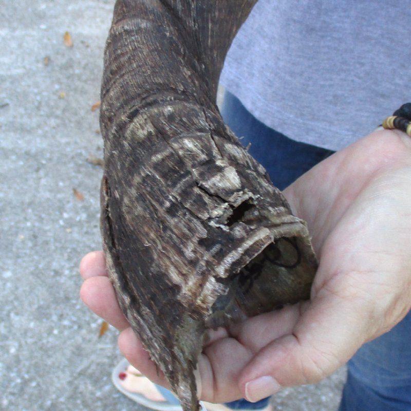 B-Grade Kudu horn for sale (Tragelaphus angasi) imported from South Africa, measuring approximately 39 inch, measured around the curl of the horn - not straight. Frayed, missing piece at base of horn, and splits. - Review photos. Kudu horns are used in making blowing horns, kudu horn instruments, furniture legs, lamps, sconces, knife handles, cane handles, inlaid crafts and numerous other taxidermy crafts.