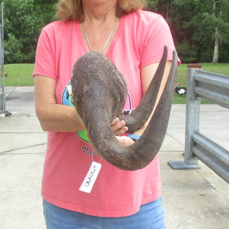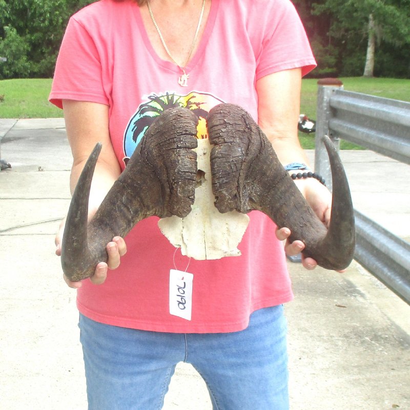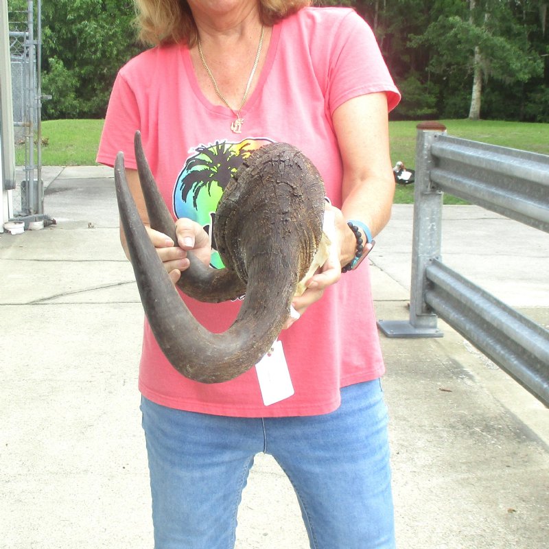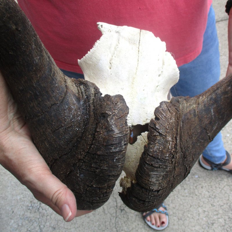 B-Grade Male African black wildebeest skull plate with horns for cabin decor and lodge decor. Hole and crack in skull. - Review photos. This black wildebeest skull plate has horns approximately 16 inches wide.