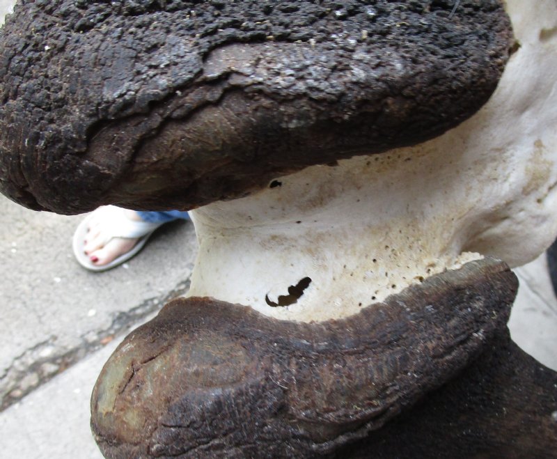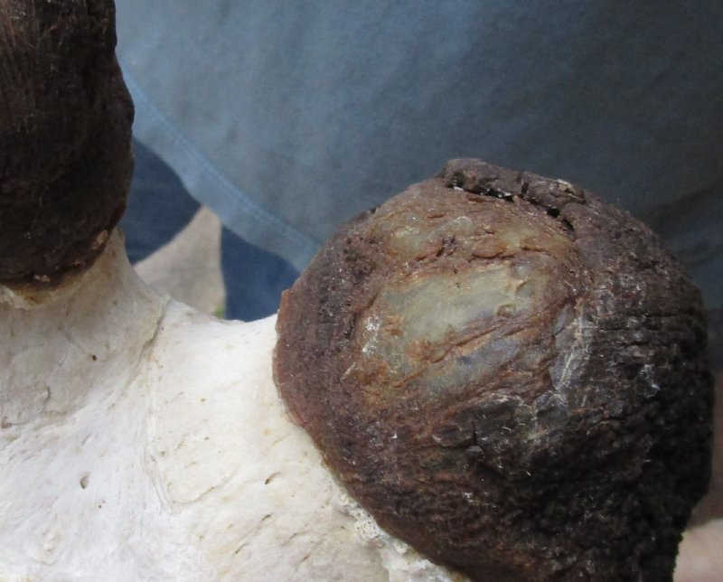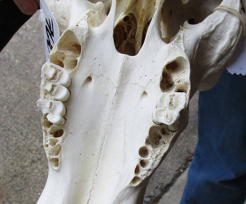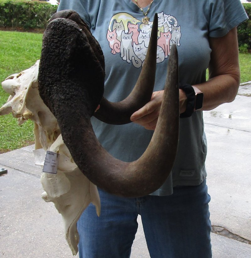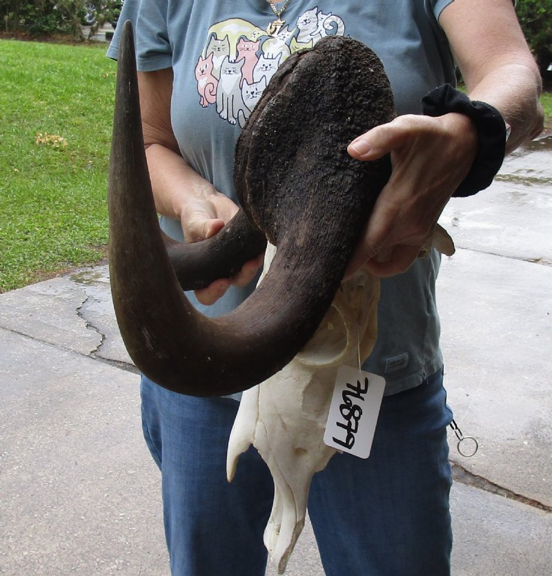 B-Grade, Male, African Black Wildebeest Skull (Connochaetes gnau). This male black wildebeest skull with horns has a horn spread of approximately 17 inches wide and the skull is approximately 19 inches long. Hole, rough spot on horn and missing teeth - Review all photos. This is a real black wildebeest skull with horns and will have imperfections caused by the animal living in the wild and fighting.