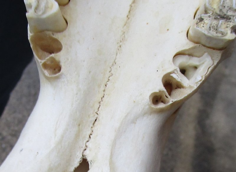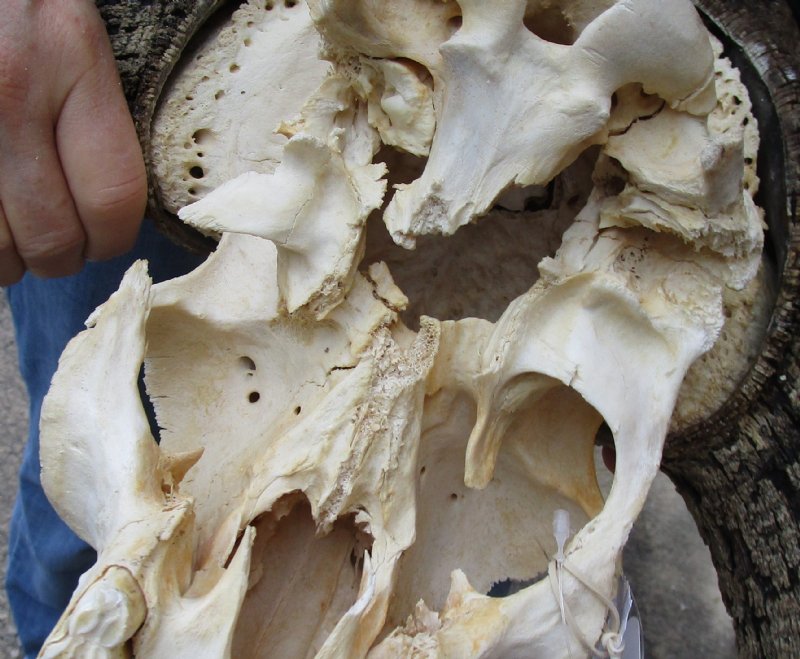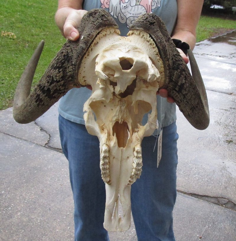 B-Grade, Male, African Black Wildebeest Skull (Connochaetes gnau). This male black wildebeest skull with horns has a horn spread of approximately 19 inches wide and the skull is approximately 18 inches long. Damaged skull and missing teeth - Review all photos. This is a real black wildebeest skull with horns and will have imperfections caused by the animal living in the wild and fighting.