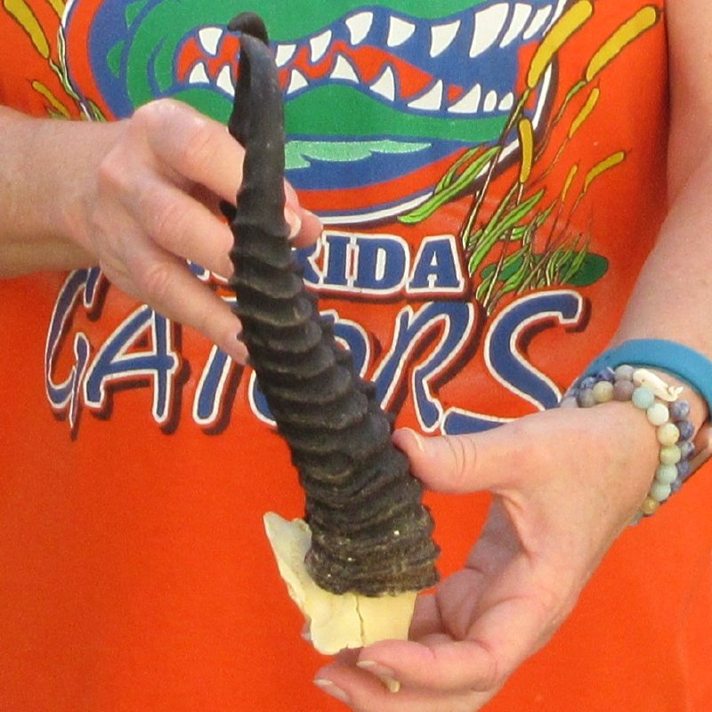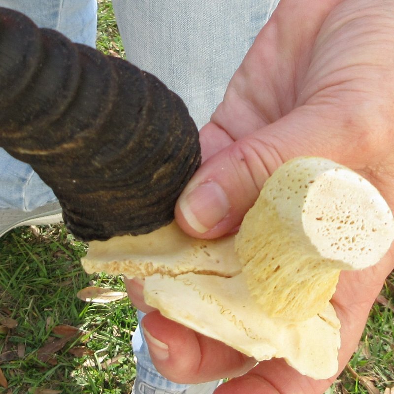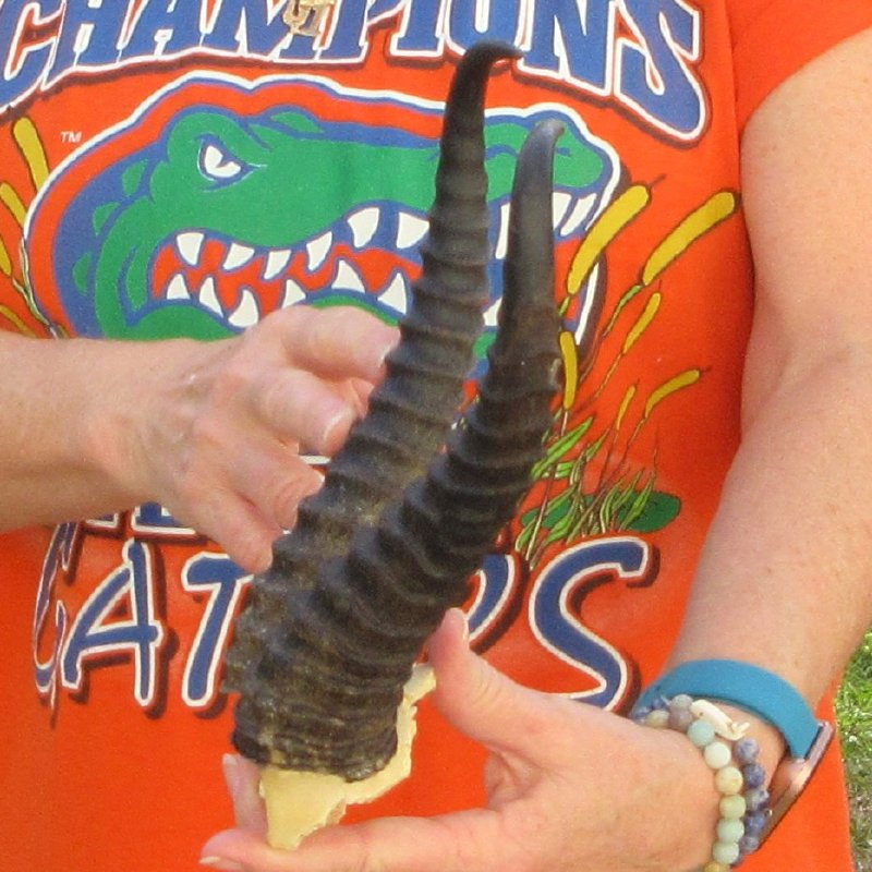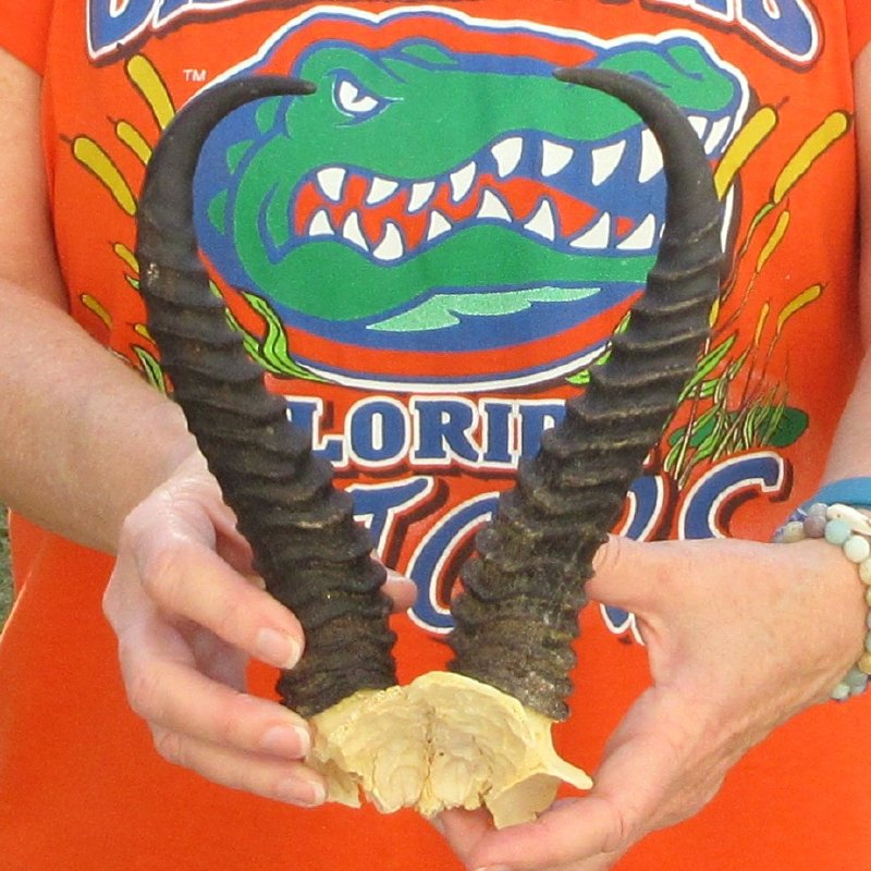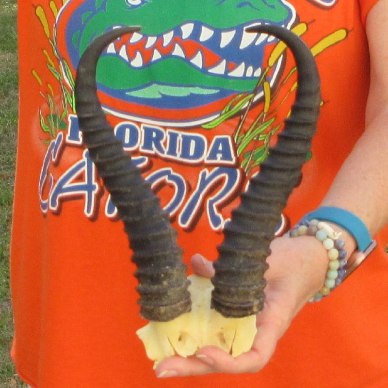 B-Grade Male Springbok Skull Plate with Horns. The horns measure approximately 10-1/4 inches, measured around the curve of the horns and are on a Springbok skull plate. - Split in back of skull. Review photos.  The skull plate with horns is from a wild African Springbok and will have imperfections caused by the animal living in the wild and the natural aging process.