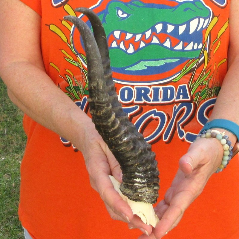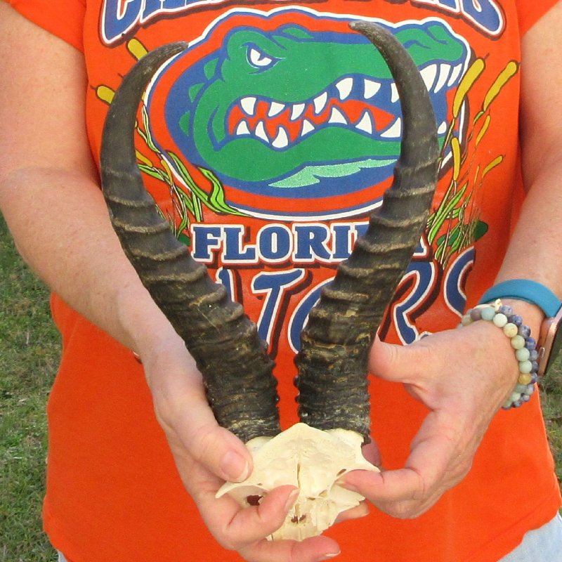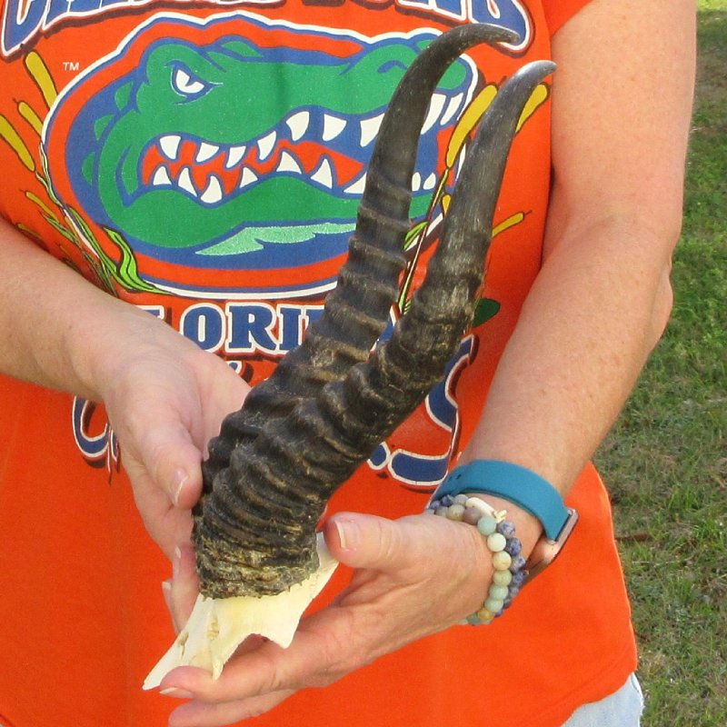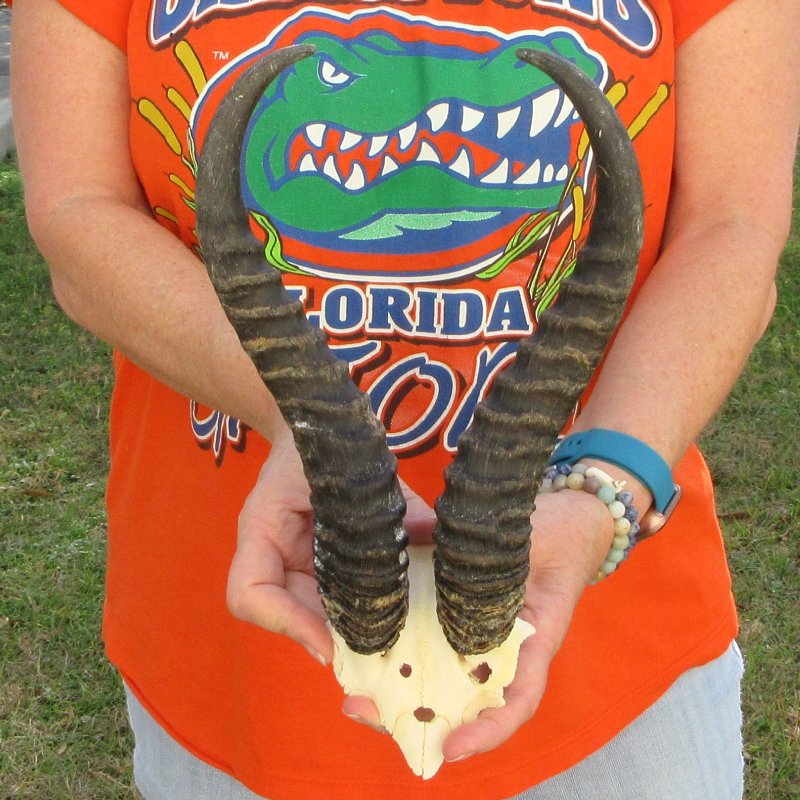 B-Grade Male Springbok Skull Plate with Horns. The horns measure approximately 11-1/2 inches, measured around the curve of the horns and are on a Springbok skull plate. -  Review photos.  The skull plate with horns is from a wild African Springbok and will have imperfections caused by the animal living in the wild and the natural aging process.