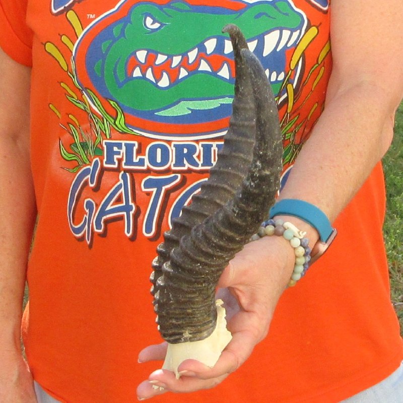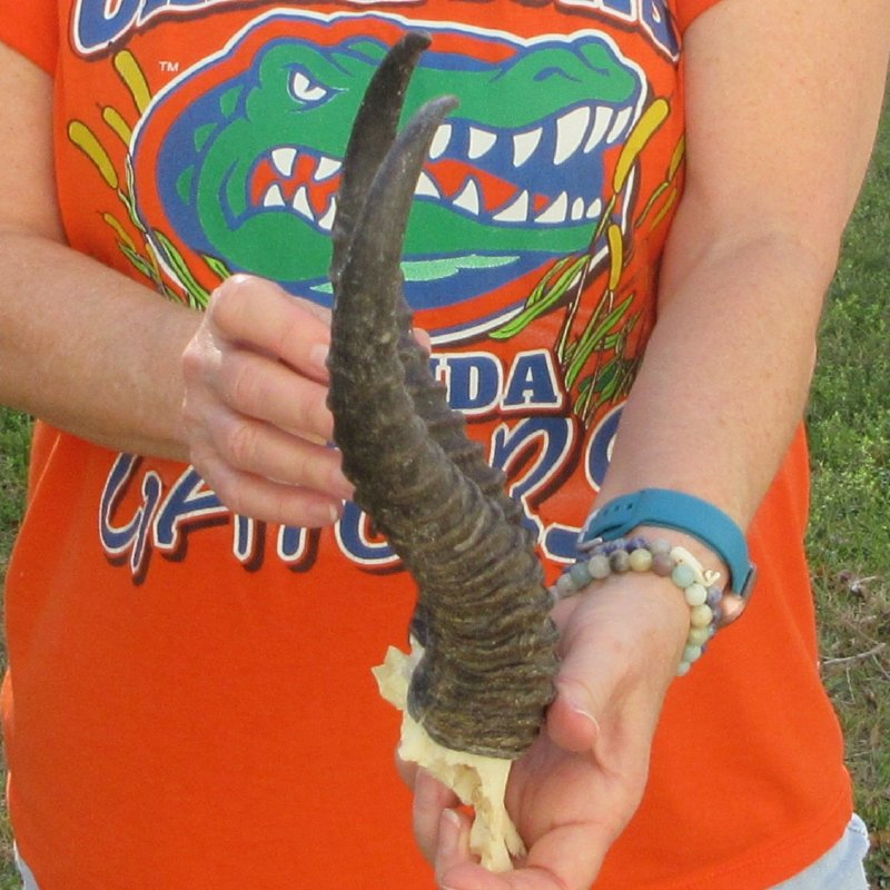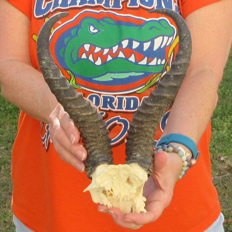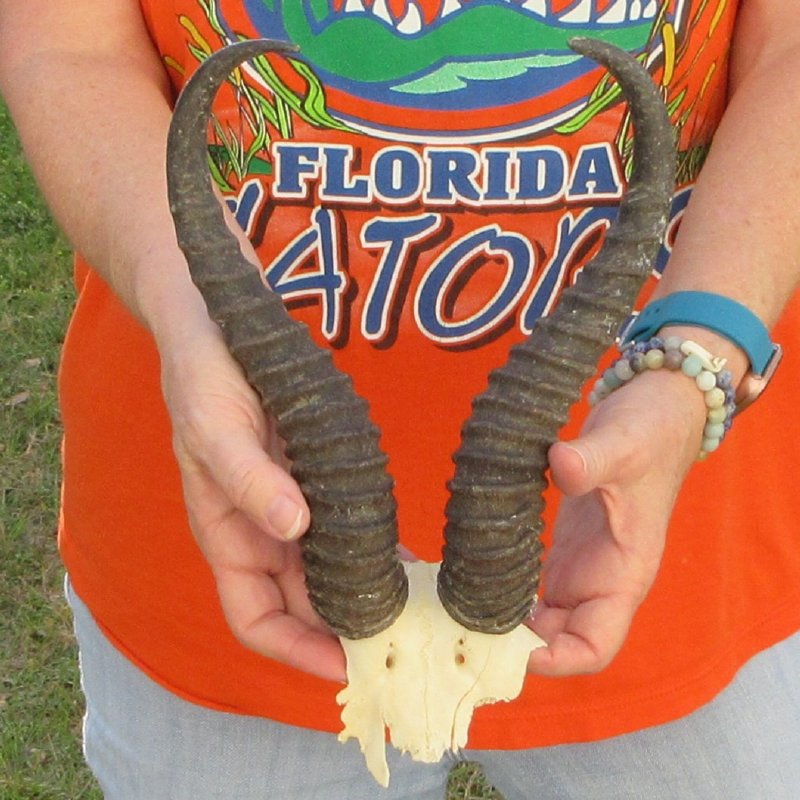 B-Grade Male Springbok Skull Plate with Horns. The horns measure approximately 11-1/4 inches, measured around the curve of the horns and are on a Springbok skull plate. -  Review photos.  The skull plate with horns is from a wild African Springbok and will have imperfections caused by the animal living in the wild and the natural aging process.