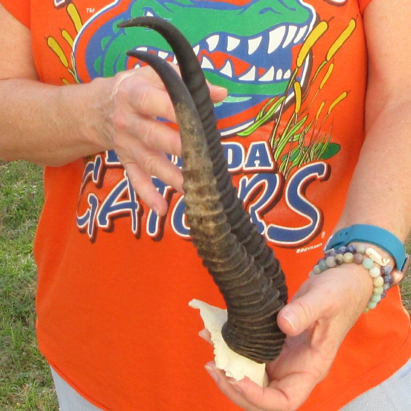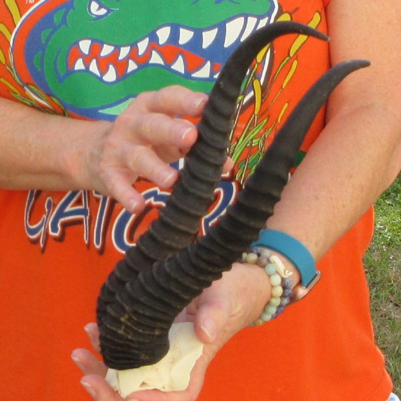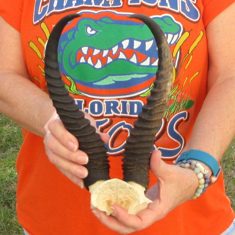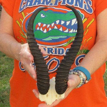 B-Grade Male Springbok Skull Plate with Horns. The horns measure approximately 11-3/4 inches, measured around the curve of the horns and are on a Springbok skull plate. -  Review photos.  The skull plate with horns is from a wild African Springbok and will have imperfections caused by the animal living in the wild and the natural aging process.