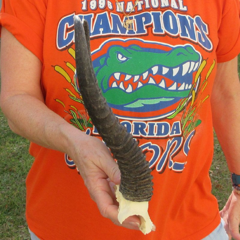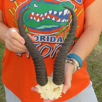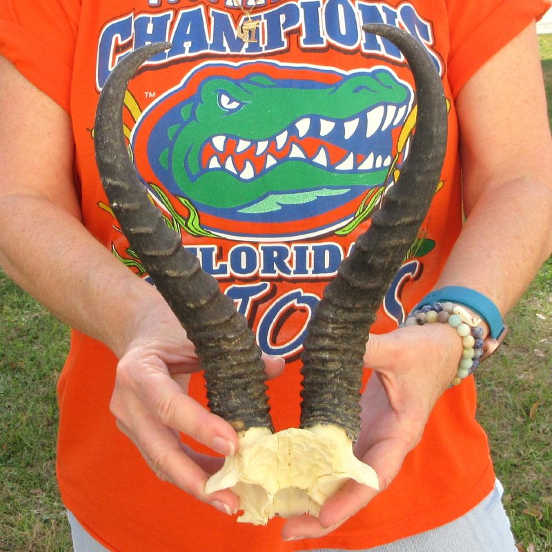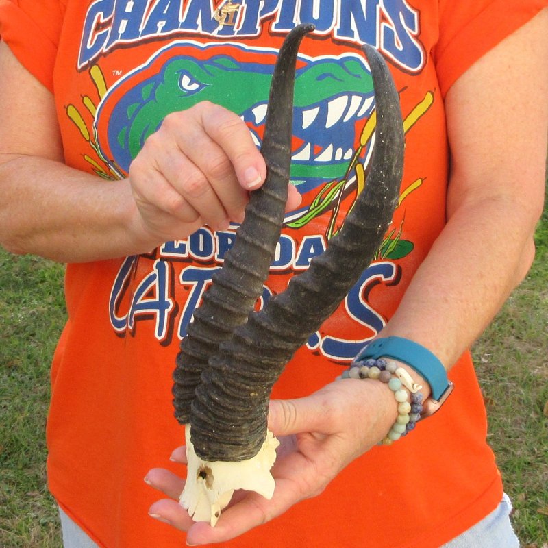B-Grade Male Springbok Skull Plate with Horns. The horns measure approximately 11-3/4 inches, measured around the curve of the horns and are on a Springbok skull plate. -  Hole in skull. Review photos.  The skull plate with horns is from a wild African Springbok and will have imperfections caused by the animal living in the wild and the natural aging process.