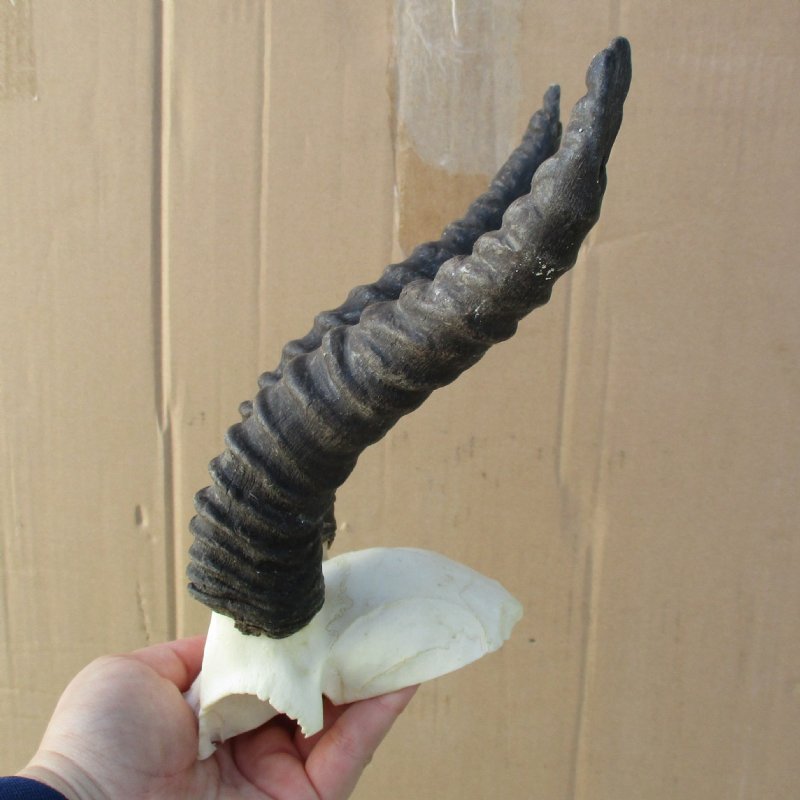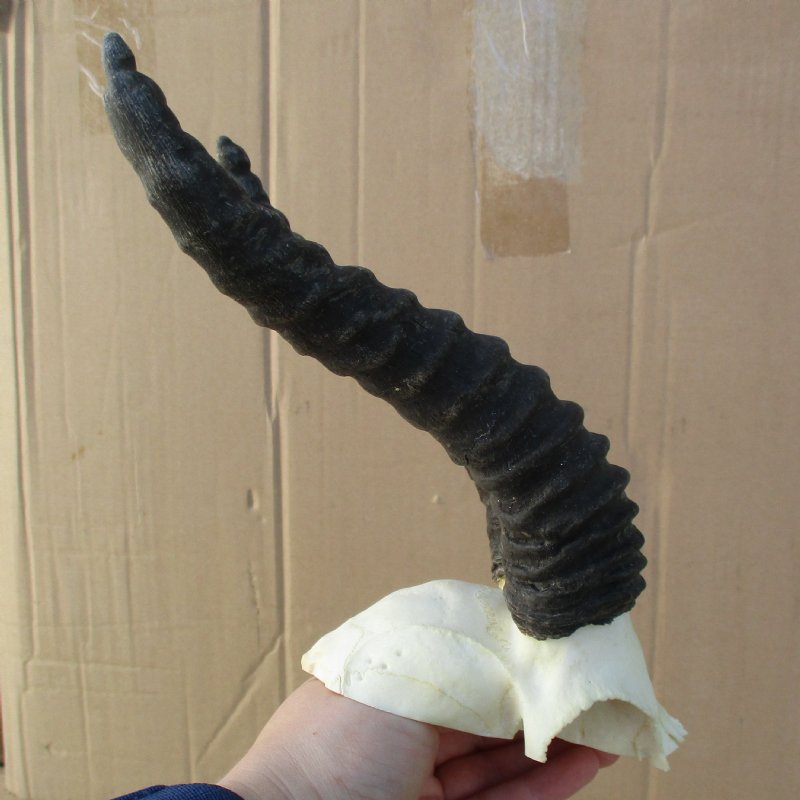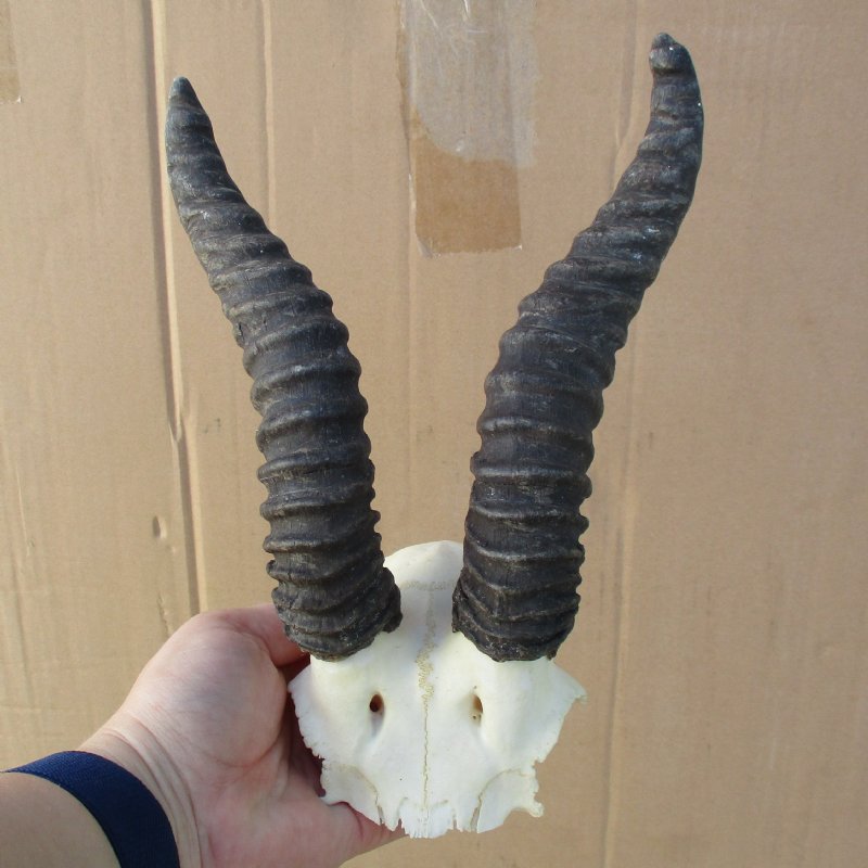 B-Grade Male Springbok Skull Plate with Horns for sale. The horns measure approximately 8 inches, measured around the curve of the horns and are on a Springbok skull plate. - Worn down, some damage to horn tips. Review photos. The skull plate with horns is from a wild African Springbok and will have imperfections caused by the animal living in the wild and the natural aging process.