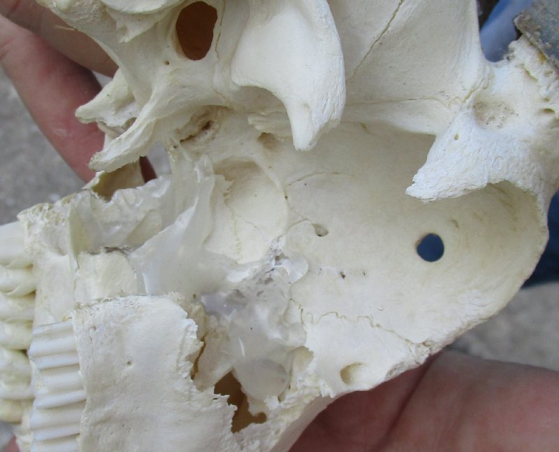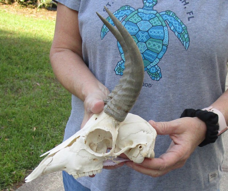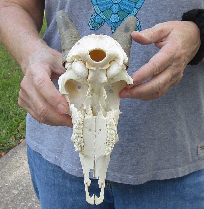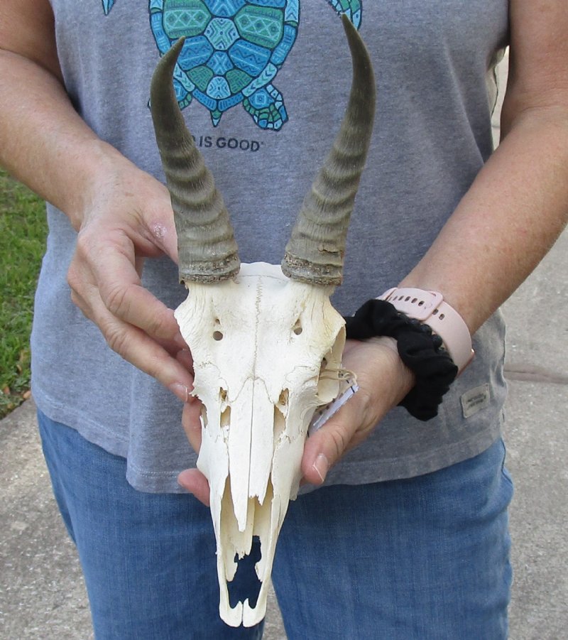 B-Grade Mountain Reedbuck skull (Redunca fulvorufula) with horns measuring approximately 7 inches, measured around the curl of the horns. The skull measures approximately 8 inches long.  Damaged skull - Review all photos. This skull with horns is perfect for cabin decor, rustic decor and for decorating your hunting lodge.
