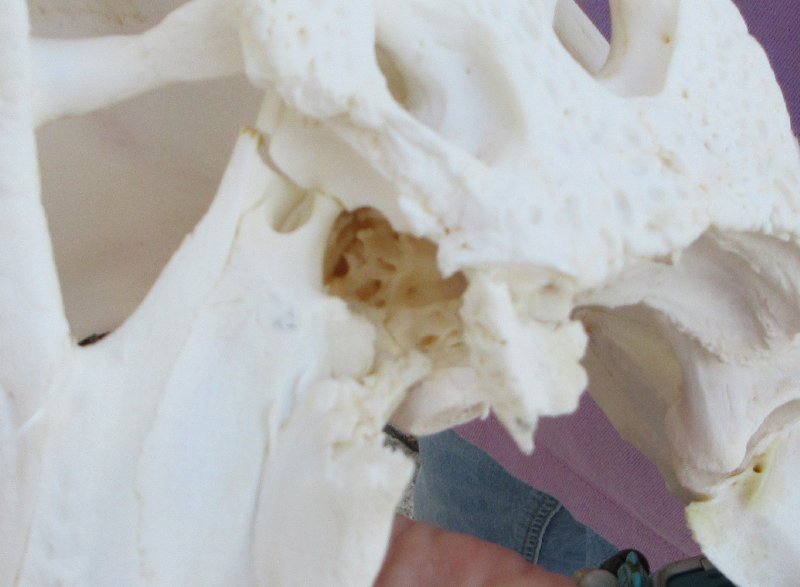 B-Grade Florida Alligator Skull (Alligator mississippiensis) measuring approximately 16 inches long and 7 inches wide and is from an estimated 8 foot Florida alligator.  The alligator skull has been beetle cleaned and whitened -  Missing piece of skull and hole in skull. Review photos.  It is a real gator skull - NOT a replica, and will have some natural blemishes, cartilage and chipped or missing teeth from living in the wild and fighting.