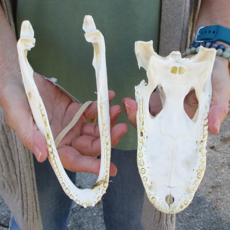 B-Grade Florida Alligator Skull (Alligator mississippiensis) measuring approximately 8-1/2 inches long and 3-1/2 inches wide and is from an estimated 4 foot Florida alligator.  - Missing part of skull on eye area and yellow tint to skull.  Review all photos. The alligator skull has been cleaned and whitened.  It is a real gator skull - NOT a replica, and will have some natural blemishes, cartilage and chipped or missing teeth from living in the wild and fighting.