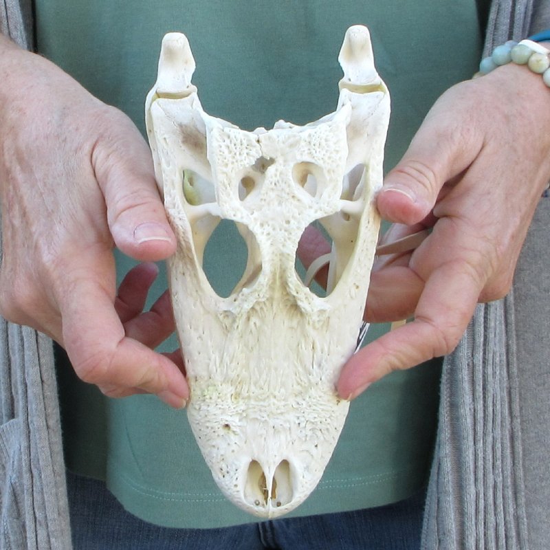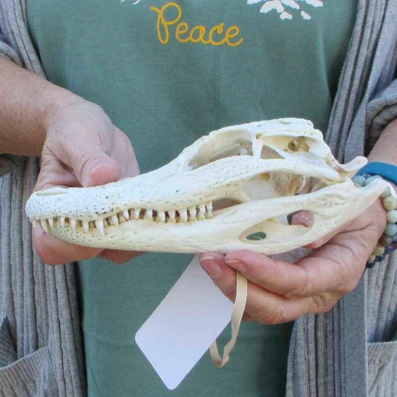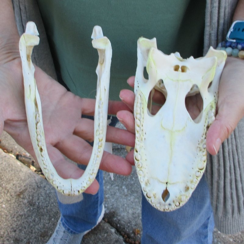 B-Grade Florida Alligator Skull (Alligator mississippiensis) measuring approximately 8 inches long and 3-1/2 inches wide and is from an estimated 4 foot Florida alligator.  - Damage to back of skull and yellow tint to skull.  Review all photos. The alligator skull has been cleaned and whitened.  It is a real gator skull - NOT a replica, and will have some natural blemishes, cartilage and chipped or missing teeth from living in the wild and fighting.