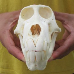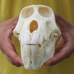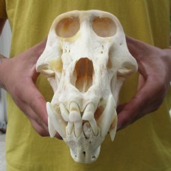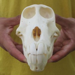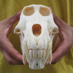 Male, Female, Sub-Adult and Juvenile Real African Baboon skulls, Chacma baboon, Pipio ursinus,  hand picked and photographed so you can see exactly what you are buying. The chacma baboon (Papio ursinus), also known as the Cape baboon, is, like all other baboons, from the Old World monkey family. It is one of the largest of all monkeys. The Chacma baboon is found to be indigenous to the savanna woodlands and mountains of South Africa.  Males of this species have large canines that are used aggressively for defense.  Adult males can weigh up to 75 lbs, however, females are much smaller.  Chacma baboons have a life span of about 18 years. All of our baboon skulls are commercial grade and imperfect.  They will have imperfections due to the natural aging process and living in the wild--scars, blemishes, rub areas, broken/missing teeth, bug bite marks, etc.  All of our real baboon skulls were harvested and cleaned in South Africa and imported into the United States under a Cities permit.  The Cities Permit Number for the baboon skulls is listed with each baboon skull pictured.