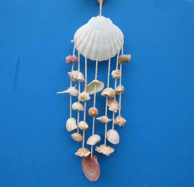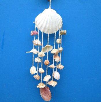 Wholesale Large Irish Baking Scallop Shell Wall Hanger, Shell Wind Chime measuring approximately 17 inches long and 6 to 7 inches wide, (not counting the hanger).  This Seashell hanger features a 4 inch large Irish Baking Shell and seven rows of rope with assorted natural hanging small conchs, babylonia, pectens, clams, scallops, turbans, murex, cockles and other seashells at the end of the chime is an Irish flat shells.. This beautiful shell hanger (wind chime) would make an attractive accent on a patio or den or to beach shops who cater to tourists looking for seashell gifts and coastal home decor.