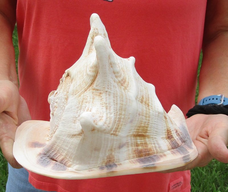 Yellow Helmet Shell, Horned Helmet Shells, Cassis cornuta are large seashells used in coastal home decorating. This shell measures approximately 8-1/2 inches long.  Yellow helmet shells, also called horned helmet shells are found in the Indo-Pacific. Helmet shells, horned helmet shells, live mostly in warm waters around the world. These yellow helmet shells, also called horned helmet shells or cassis cornuta are beautiful peach colored shells. This is a real shell - not a replica.  It will have some imperfections (chips, calcium, rough spots, broken tips, etc.) from living in the oceans and aging.