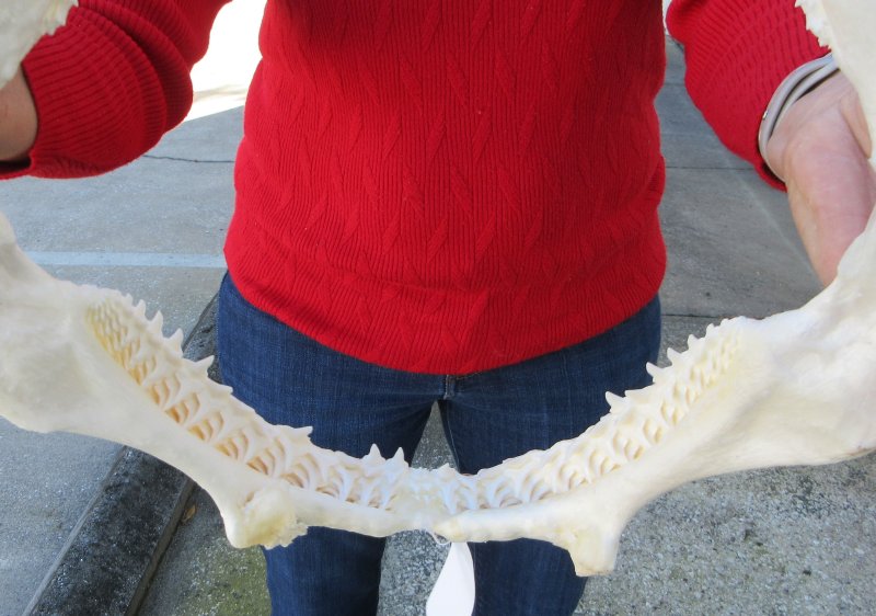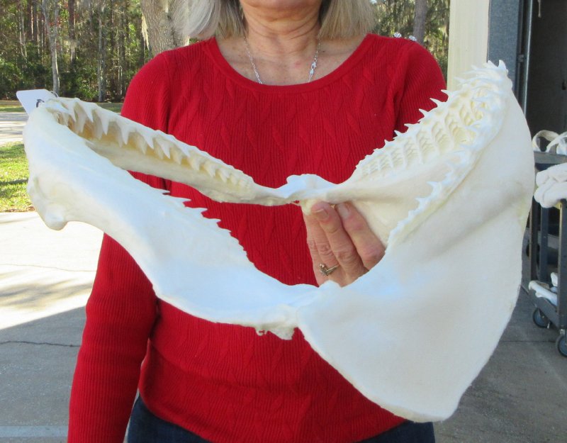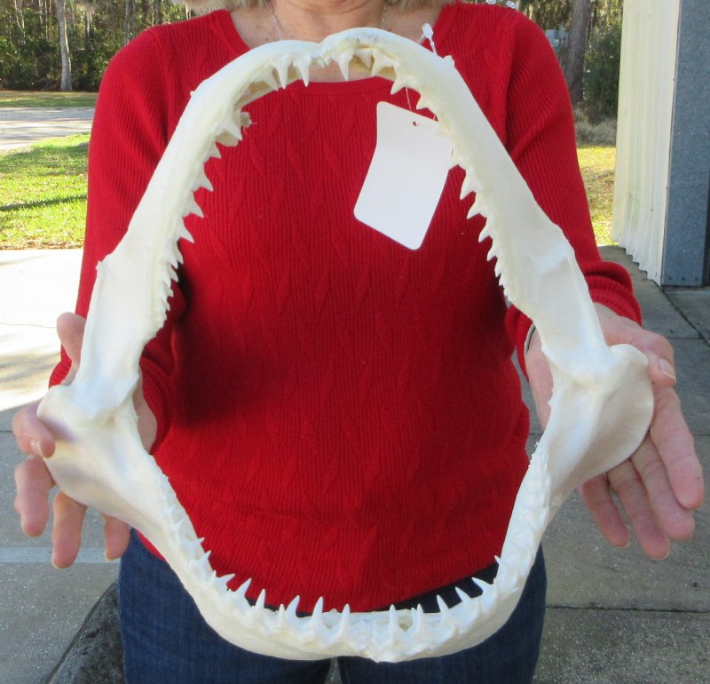 Blacktip (Carcharhinus Limbatus) shark jaw for sale measuring approximately 13-1/2 inches wide and 11-1/2 inches tall, measured straight across jaw from left side to right side.  Our shark jaws are imported from Taiwan have been cleaned and whitened. Shark jaws are used for display and for shark collectors. They are real and will have imperfections such as cuts or scrapes on the cartilage area, some missing or broken teeth, some small holes in the cartilage and there may be an odor from the cleaning agents used.