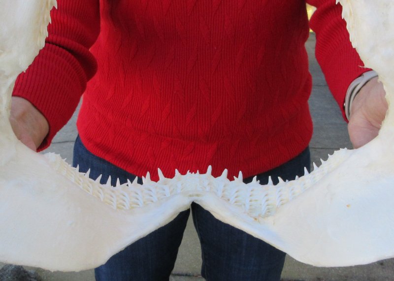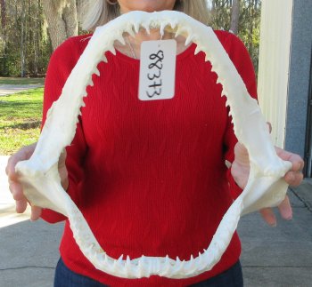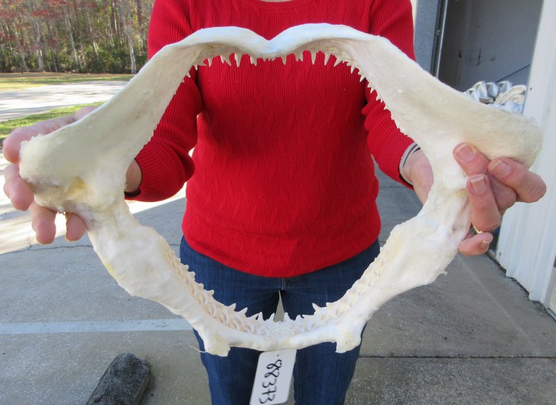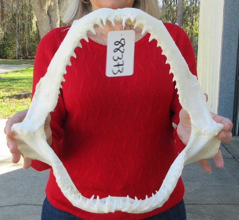 Blacktip (Carcharhinus Limbatus) shark jaw for sale measuring approximately 14-1/2 inches wide and 11-1/2 inches tall, measured straight across jaw from left side to right side.  Our shark jaws are imported from Taiwan have been cleaned and whitened. Shark jaws are used for display and for shark collectors. They are real and will have imperfections such as cuts or scrapes on the cartilage area, some missing or broken teeth, some small holes in the cartilage and there may be an odor from the cleaning agents used.