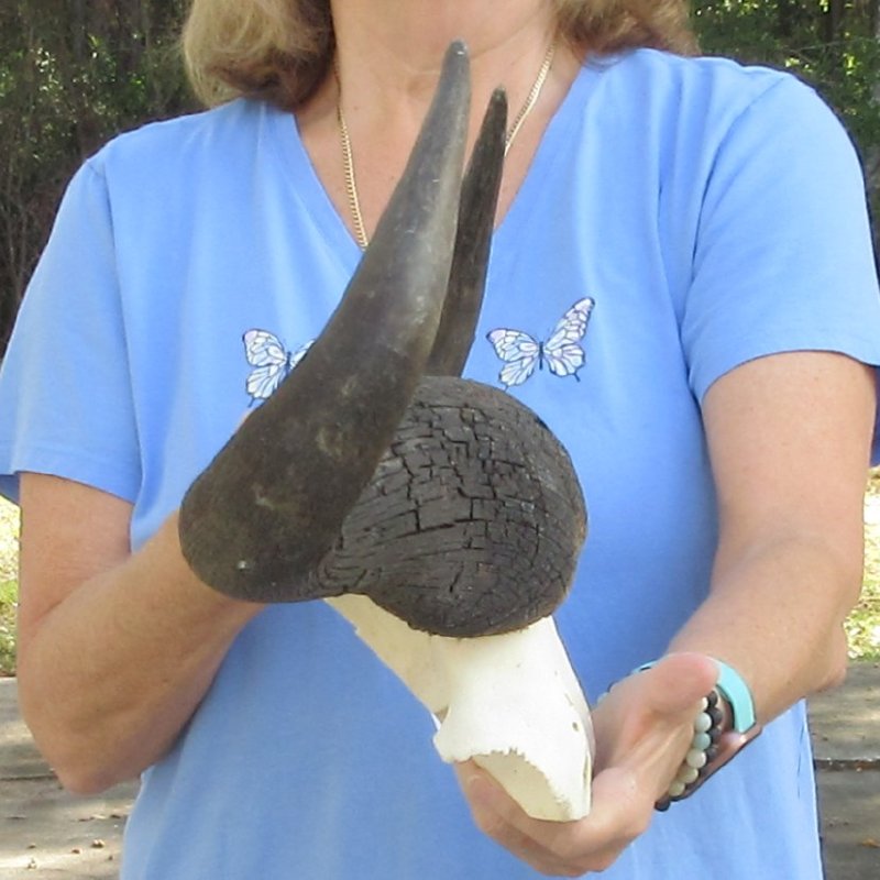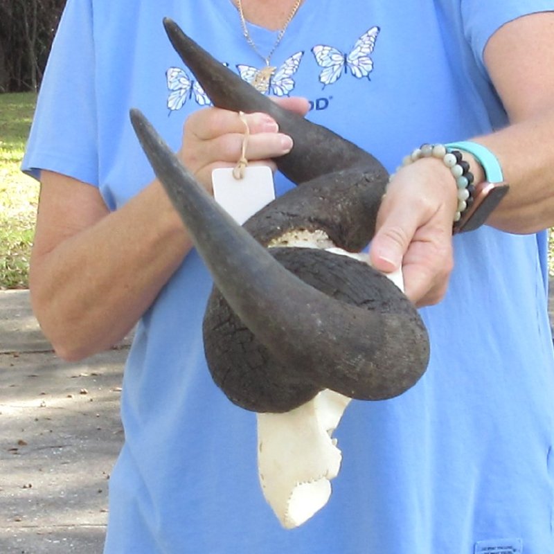 African Blue Wildebeest Skull Plate (Connochaetes gnau) for sale. This blue wildebeest skull plate with horns has a horn spread of approximately 21-3/4 inches wide. - Review all photos. This is a real blue wildebeest skull plate with horns and will have imperfections caused by the animal living in the wild and fighting, such as cracks, holes, blemishes, rub areas, etc. All of our wildebeest skull plates with horns are by-products of the African Government's culling program and farming industry. All products were professionally cleaned in South Africa and cleared by the U.S Fish and Wildlife Services and U.S. Customs Services for legal entry into the United States.