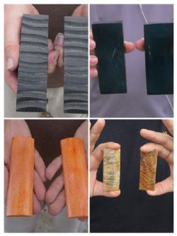 Knife handle material made from real animal bones and animal horns. Our selection includes knife scales and slabs in smooth, cylindrical, dyed, and antiqued and bark texture jigged, jigged impala, stag jigged, black and white streak and pick jigged. Also ivory from African warthog tusks and hippo tusks are sold by the pound.