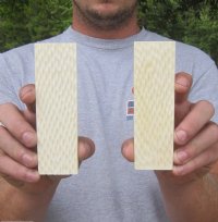 Knife handle material, buffalo bone knife scales, camel bone knife scales and bone blanks are sold in pairs. We have buffalo bone scales in natural white bone and dyed amber color, dyed red, dyed brown, and dyed green. We also sell camel bone knife scales in smooth, jigged bone knife scales and jigged stag patterns. These are made from real water buffalo bone and real camel bone and have been imported from India. The pairs shown below have been hand selected and photographed. You are buying what you see.