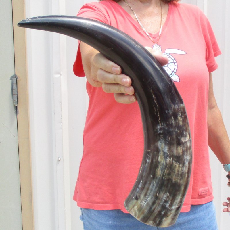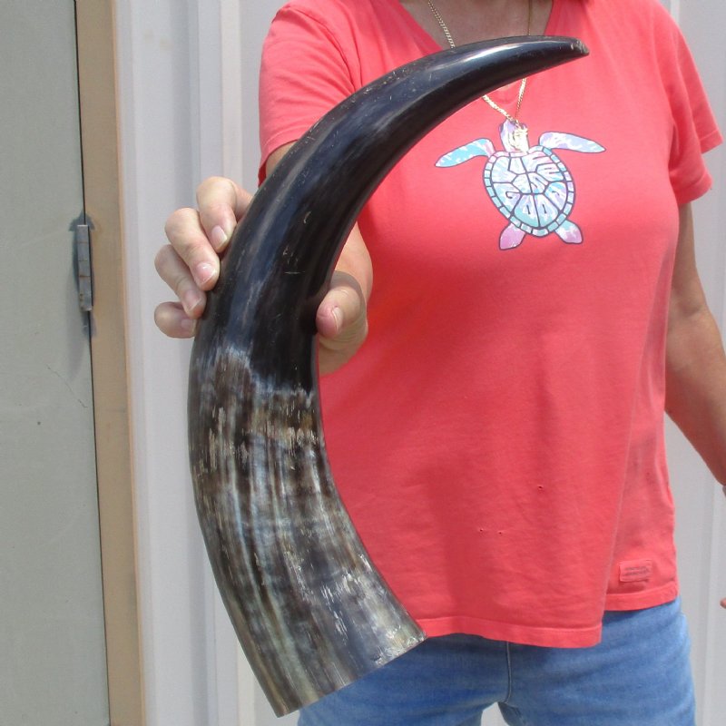 Buffed water buffalo horns from India, Bubalus bubalis, measuring 20 inches around the curve of the horn using a cloth tape measure. This horn has been cleaned and buffed, but not polished to a smooth shine.  There may be rough patches and scratches throughout the horns and overall they appear more rustic than our polished buffalo horns. Buffed buffalo horns vary in coloring, size and shape and are used for making animal horn jewelry, in cabin decor, rustic decorating, in making knife and cane handles.