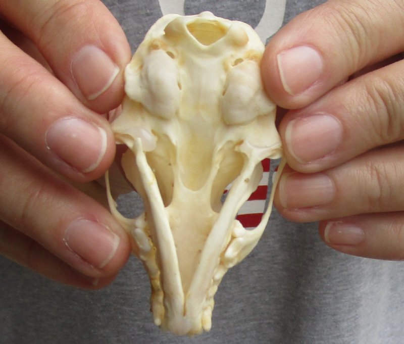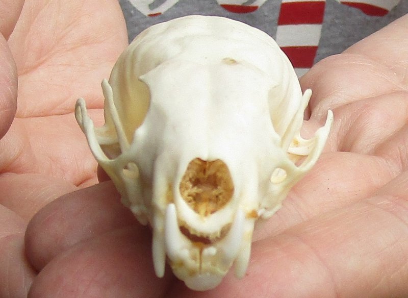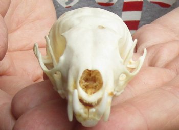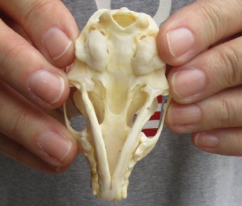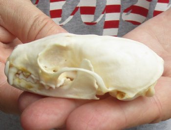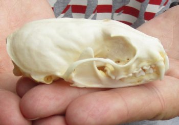 This is an American pine marten skull, measuring approximately 3 inches long and 1-3/4 inches in wide. This American pine marten skull has been cleaned; however, there may be dark spots on some of the skulls. The mouth has been glued shut, using hot melt glue. The skull will have natural imperfections. The American marten is a long, slender-bodied weasel about the size of a mink with relatively large rounded ears, short limbs, and a bushy tail.  American marten have a roughly triangular head and sharp nose.  Their long, silky fur ranges in color from pale yellowish buff to tawny brown to almost black.  Their head is usually lighter than the rest of their body, while the tail and legs are darker.  American marten usually have a characteristic throat and chest bib ranging in color from pale straw to vivid orange.