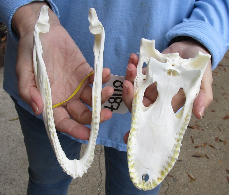 B-Grade Florida Alligator Skull (Alligator mississippiensis) measuring approximately 8 inches long and 3 inches wide and is from an estimated 4 foot Florida alligator.   Missing teeth, damage to skull and dried cartilage around teeth - Review all photos. The alligator skull has been cleaned and whitened.  It is a real gator skull - NOT a replica, and will have some natural blemishes, cartilage and chipped or missing teeth from living in the wild and fighting.