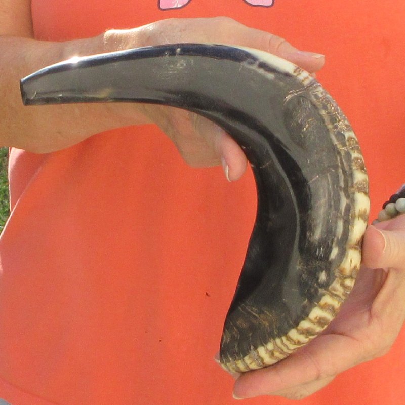 Polished Sheep Horn Shofar measuring approximately 14-3/4 inches measured around the curve of the horn using a cloth tape measure.   This polished sheep horn is already made into a shofar. A shofar is an ancient musical horn typically made of a ram's horn, used for Jewish religious purposes.  Like the modern bugle, the shofar lacks pitch-altering devices, with all pitch control done by varying the player's embouchure.  Shofars come in a variety of sizes and shapes, depending on the choice of animal and level of finish.