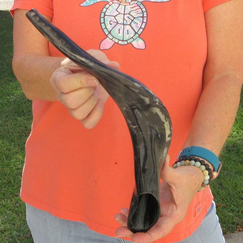 Polished Sheep Horn Shofar measuring approximately 17-1/4 inches measured around the curve of the horn using a cloth tape measure.   This polished sheep horn is already made into a shofar. A shofar is an ancient musical horn typically made of a ram's horn, used for Jewish religious purposes.  Like the modern bugle, the shofar lacks pitch-altering devices, with all pitch control done by varying the player's embouchure.  Shofars come in a variety of sizes and shapes, depending on the choice of animal and level of finish.