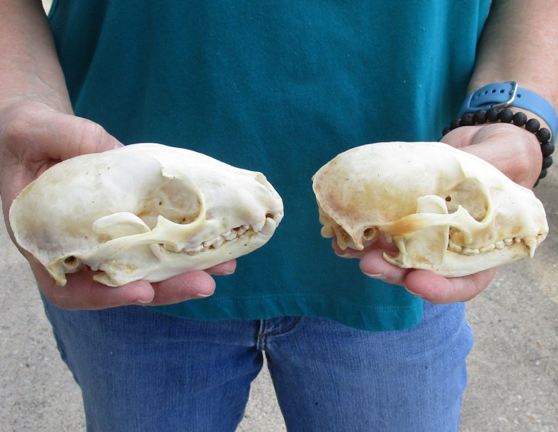 2 pc lot of B-Grade Raccoon skulls, small animal skulls.  Raccoon skulls both measure approximately 4-1/2 inches long and 2-3/4 inches wide. These are discounted/damaged skulls - discolored, some broken teeth, jaws glued shut -  Review all photos. The raccoon skull is a small animal skull from a wild raccoon and will have natural imperfections found on all wild animal skulls. Our raccoon skulls have been cleaned however some still will have a golden color or will have patches of light yellow.
