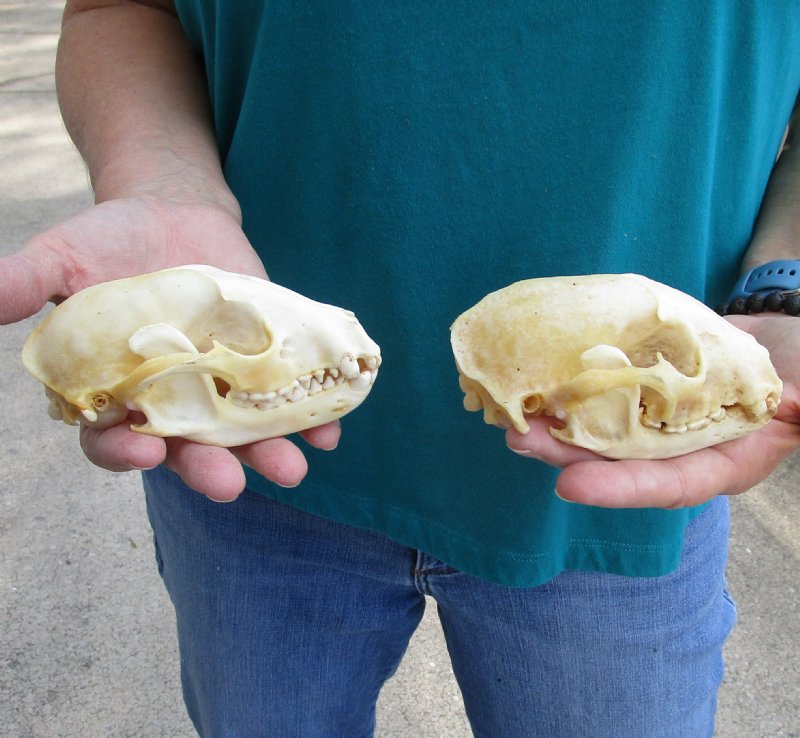 2 pc lot of B-Grade Raccoon skulls, small animal skulls.  Raccoon skulls both measure approximately 4-1/2 inches long and 2-3/4 inches wide. These are discounted/damaged skulls - discolored, missing/broken teeth, jaws glued shut -  Review all photos. The raccoon skull is a small animal skull from a wild raccoon and will have natural imperfections found on all wild animal skulls. Our raccoon skulls have been cleaned however some still will have a golden color or will have patches of light yellow.