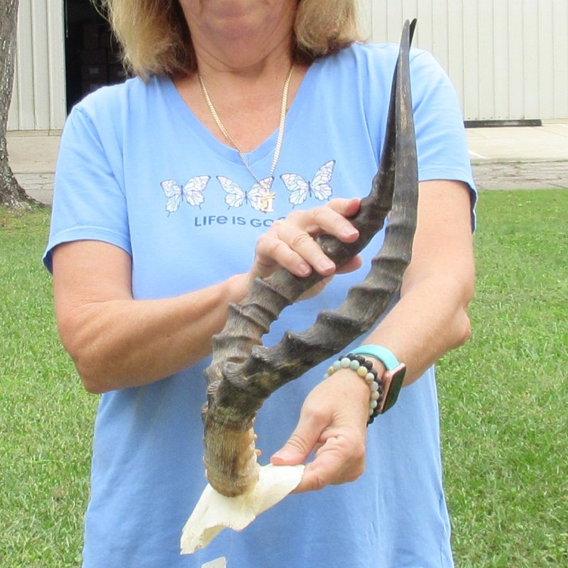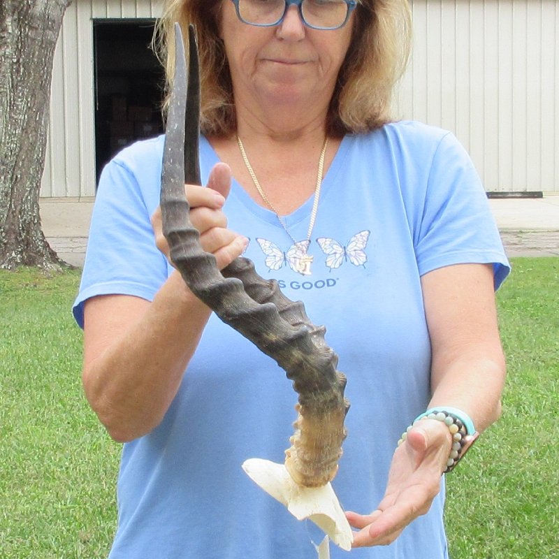 African Impala skull plate and horns for sale (Aeryceros melampus) for rustic cabin decor and African themed decorating.  The horns measure approximately 20 inches measured around the curve of the horns with a cloth tape measure, not straight up and down with a ruler.     - Review all photos carefully as this is the one you are buying.   This skull plate and horns is from a wild African Impala and will have imperfections normally found on all wild Impalas from living in the wild, aging and fighting.