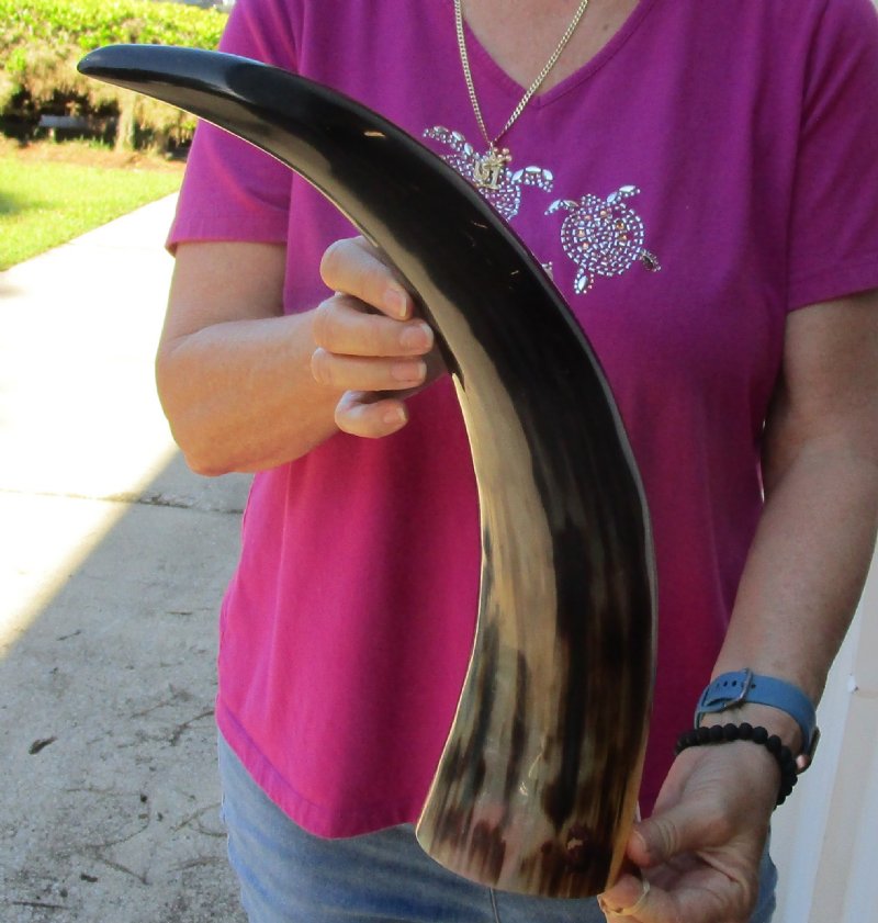 Polished Buffalo Horn with a Wide Base (Bubalus bubalis) for sale from an Indian Water Buffalo, measuring approximately 21 inches, measured around the curve of the horn using a cloth tape measure. The opening at the base of the horn is wide.  This horn may have some small, minor unfinished/rough areas. This horn does not stand unsupported. Our buffalo horns may have natural imperfections such as bubbles, indentations/divots, tiny pimples and surface cracks and scrapes. Review all photos.  Buffalo horns vary in coloring, size and shape and are used for making animal horn jewelry, in cabin decor, rustic decor, as knife handle material and for cane handles, for carving, in the art of scrimshaw and in making inlaid instruments. These may have a tag on them this is a requirement of the U.S Customs Department. All products imported into the U.S must have a Country of Origin tag.