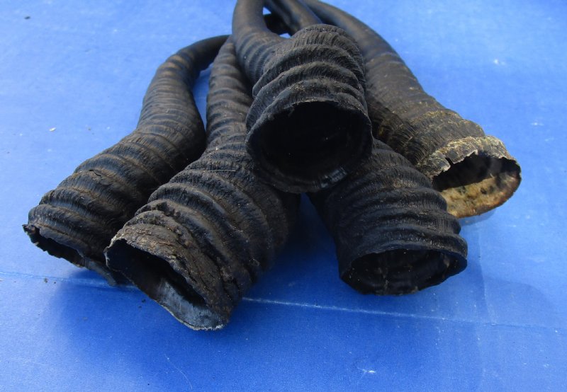 5 piece lot of authentic male springbok horns from wild African Springbok, measuring approximately 10 to 13 inches long, measured around the curve of the horn using a cloth tape measure, not straight up and down with a ruler.  Review all photos. Springbok horns are used in making furniture, cane handles and in numerous taxidermy crafts. These are real polished springbok horns and they will have natural imperfections from living in the wild and using their horns for fighting, such as tiny chips and small splits at the mouth opening, tiny cuts, scars, blemishes, etc.